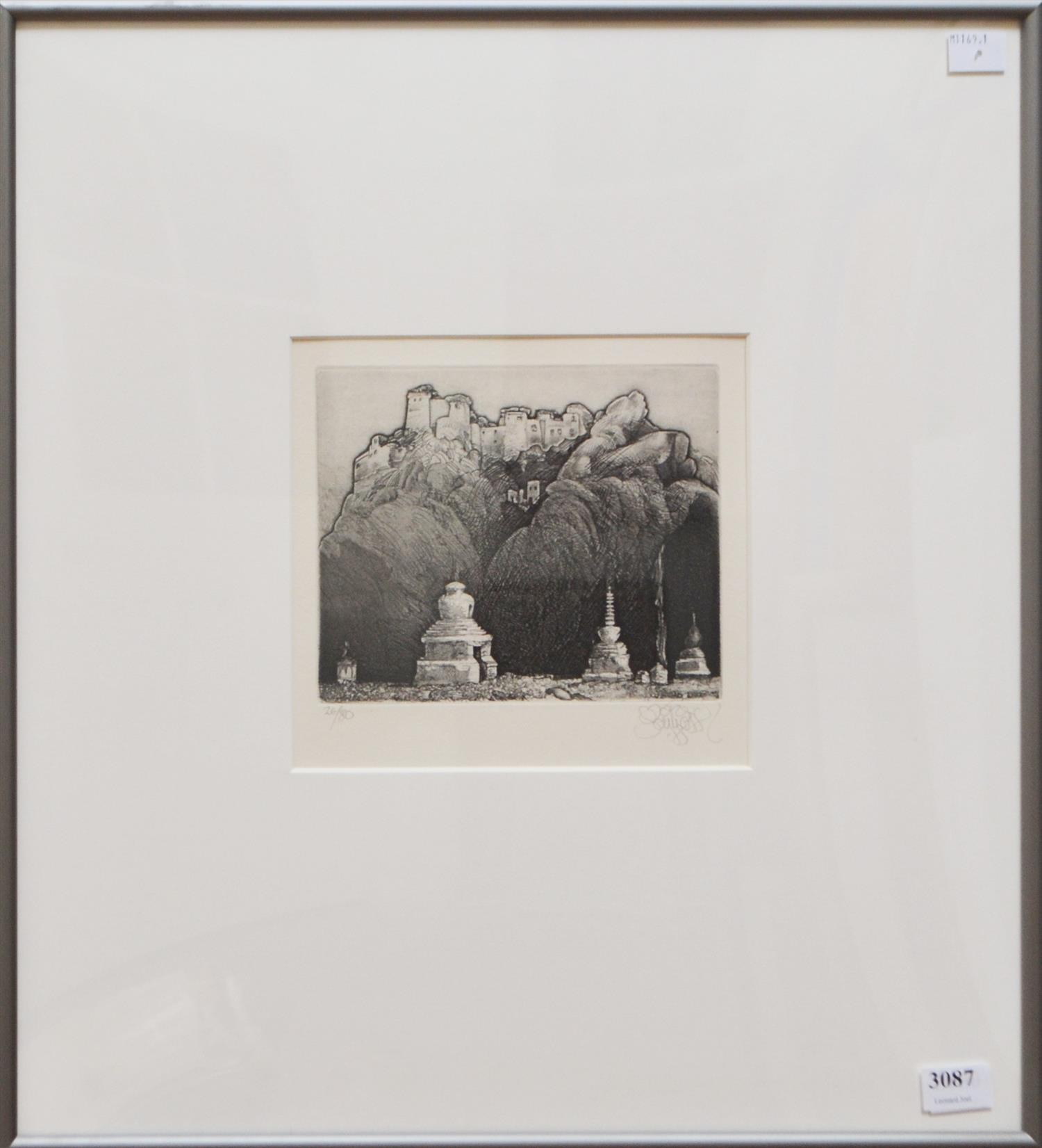 JORG SCHMEISSER, UNTITLED (CASTLE ON THE HILLSIDE), ETCHING 26/80, 13 X 16CM