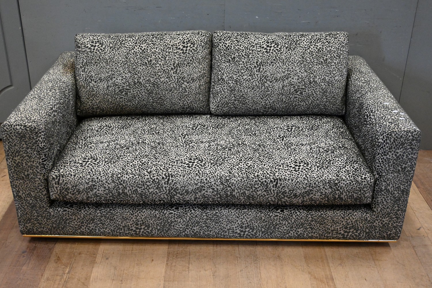 A CONTEMPORARY THREE SEATER SOFA IN ANIMAL PRINT FABRIC (A/F) (64H x 177W x 104D CM) (PLEASE NOTE THIS HEAVY ITEM MUST BE REMOVED BY CARRIERS AT THE CUSTOMER'S EXPENSE. LEONARD JOEL STAFF CANNOT ASSIST CARRYING THIS ITEM) (X-LARGE ITEM)
