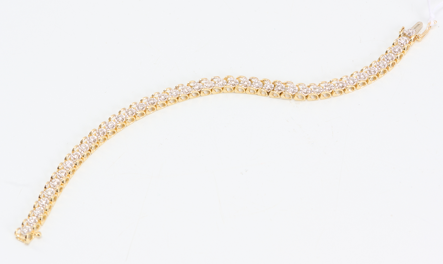 A DIAMOND BRACELET IN 10CT TWO TONE GOLD, THE DIAMONDS TOTALLING 1.8CTS, LENGTH 180MM
