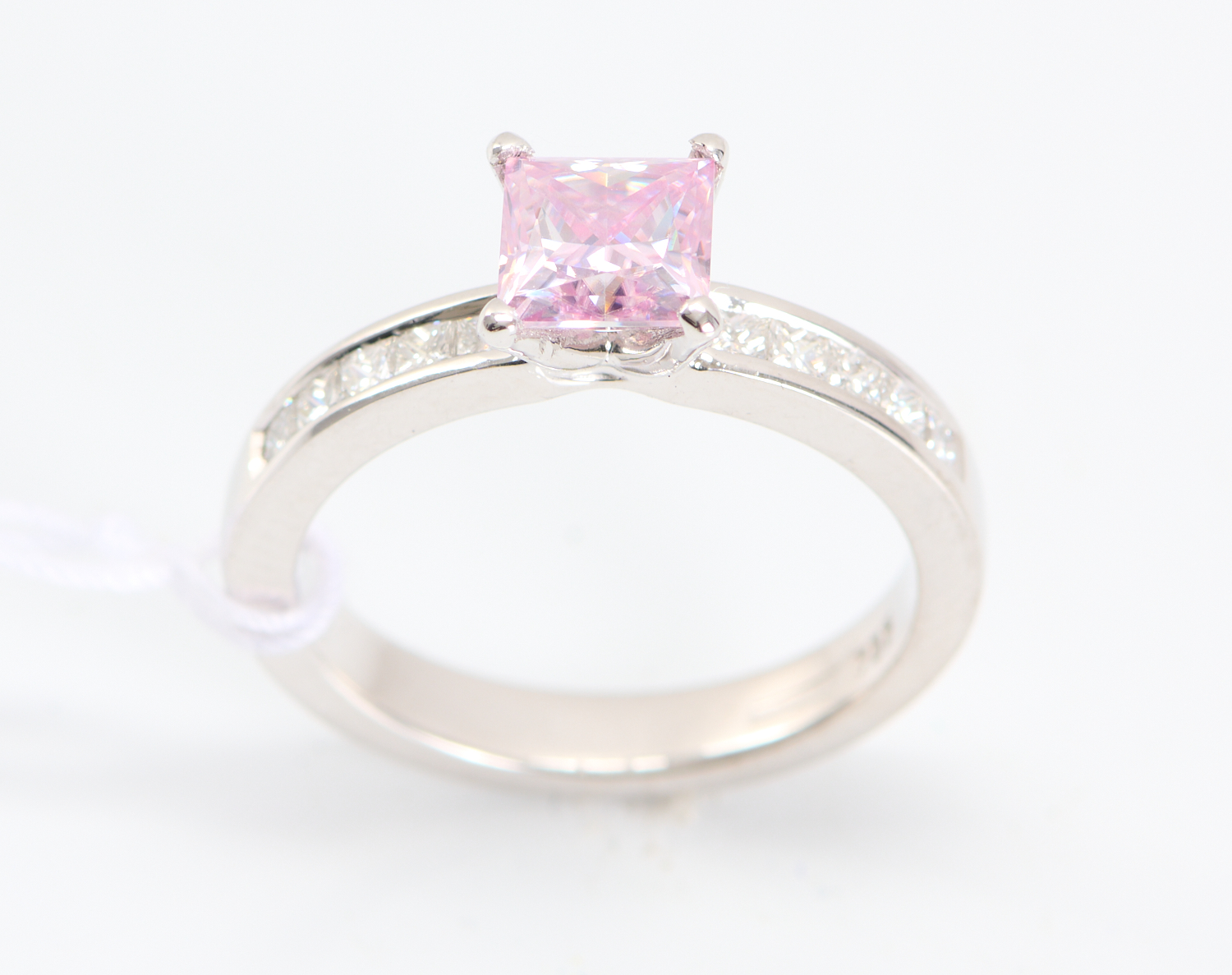 A DIAMOND AND PINK MOISSANITE RING IN 18CT WHITE GOLD, THE MOISSANITE TOTALLING 1CT, RING SIZE L-M