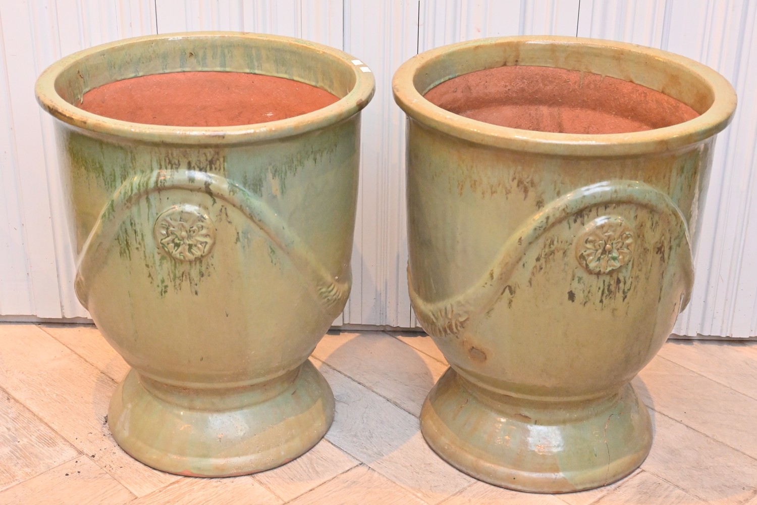 A PAIR OF LARGE FRENCH STYLE GLAZED URNS (ONE A/F) (57H x 48D CM) (PLEASE NOTE THIS HEAVY ITEM MUST BE REMOVED BY CARRIERS AT THE CUSTOMER'S EXPENSE. LEONARD JOEL STAFF CANNOT ASSIST CARRYING THIS ITEM) (X-LARGE ITEM)