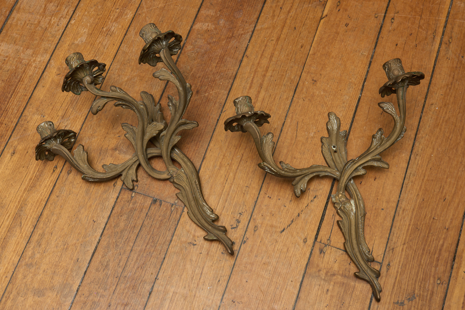A PAIR OF BRASS WALL SCONCES, H. 43CM, LEONARD JOEL LOCAL DELIVERY SIZE: SMALL