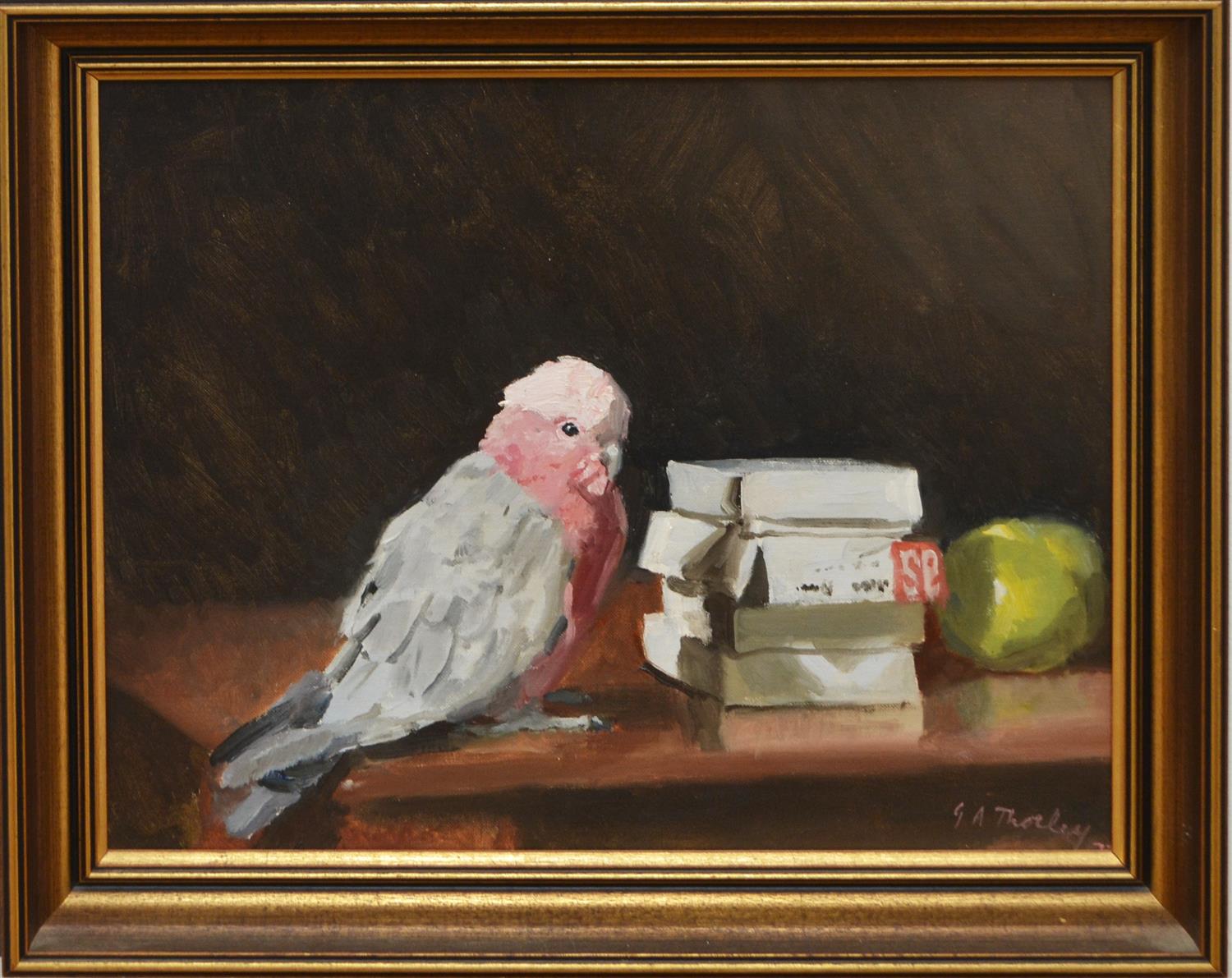 GRAHAM THORLEY, GALAH AND BOOKS, OIL ON BOARD, 38 X 48CM