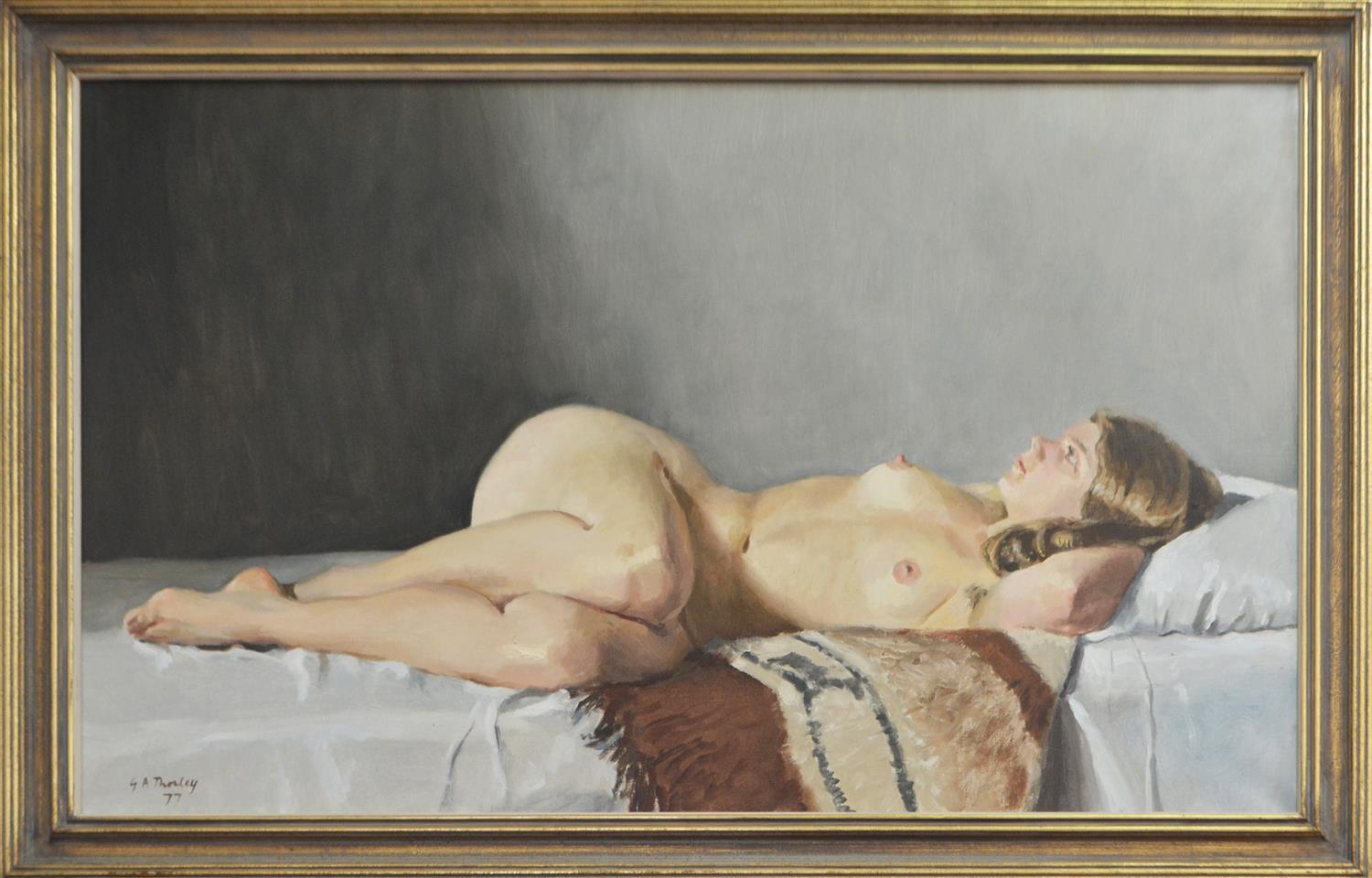 GRAHAM THORLEY, NUDE ON THE BED 1977, OIL ON CANVAS, 75 X 124CM
