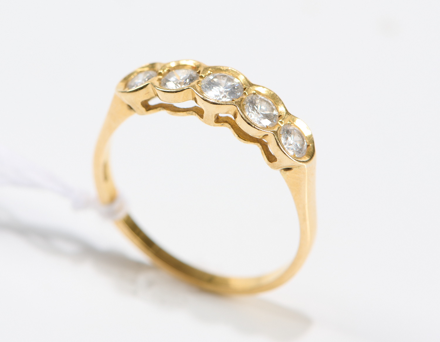 A FIVE STONE DIAMOND RING IN 9CT GOLD, RING SIZE N/O, 2.7GMS