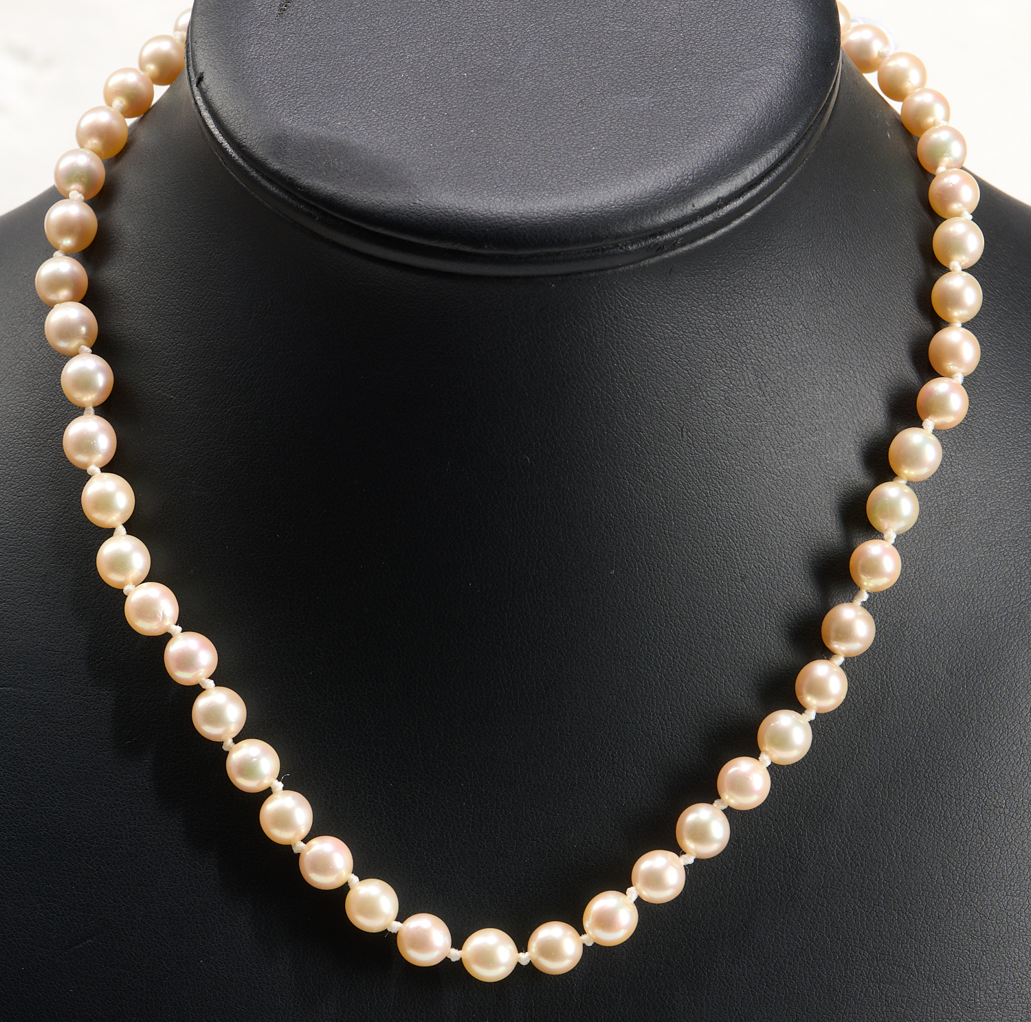 A STRAND OF CULTURED PEARLS TO A 9CT GOLD AND PEARL CLASP STAMPED JKAL, LENGTH APPROXIMATELY 460MM