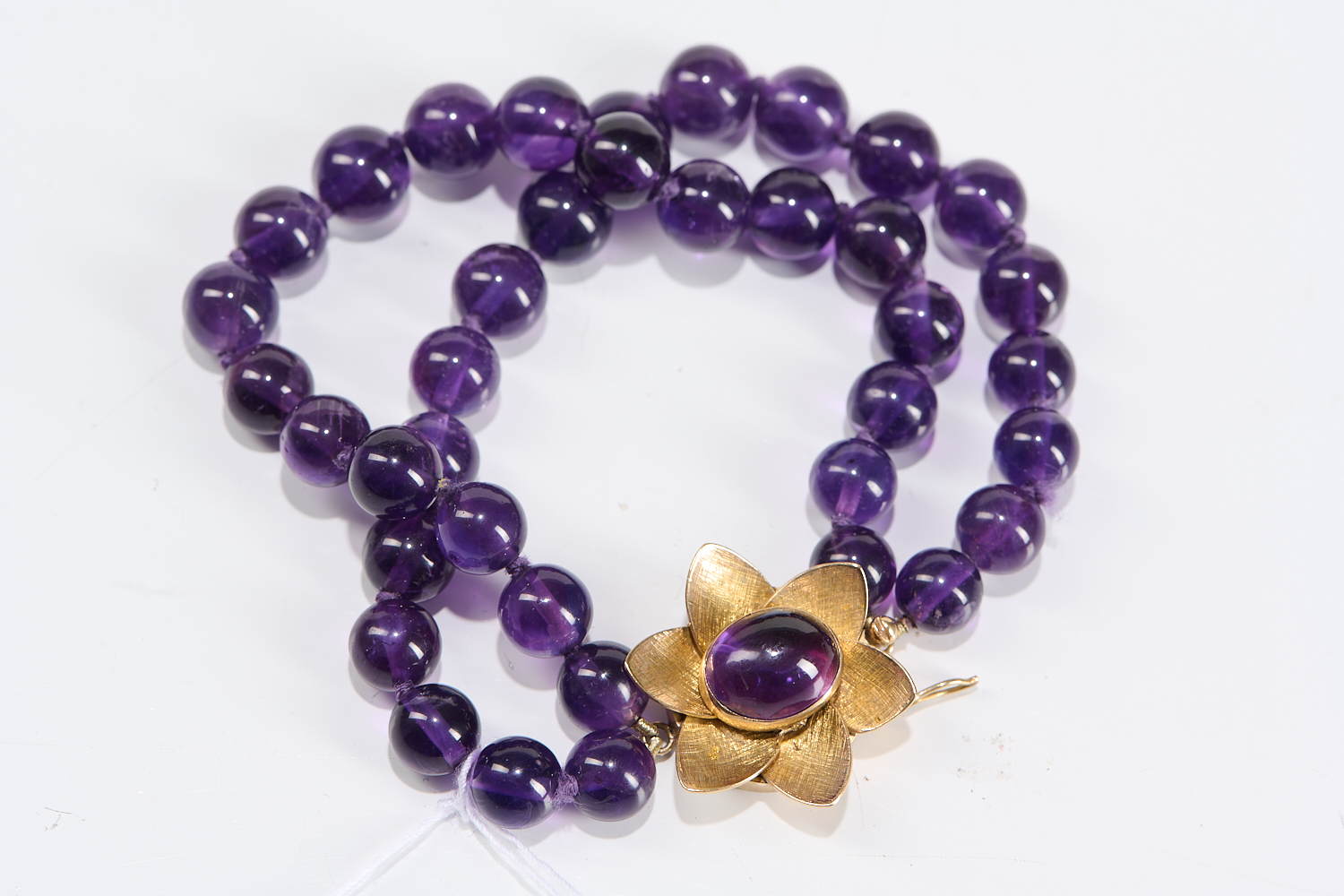 A DOUBLE STRAND AMETHYST BEAD BRACELET TO A 9CT GOLD AND AMETHYST FLORAL FEATURE CLASP