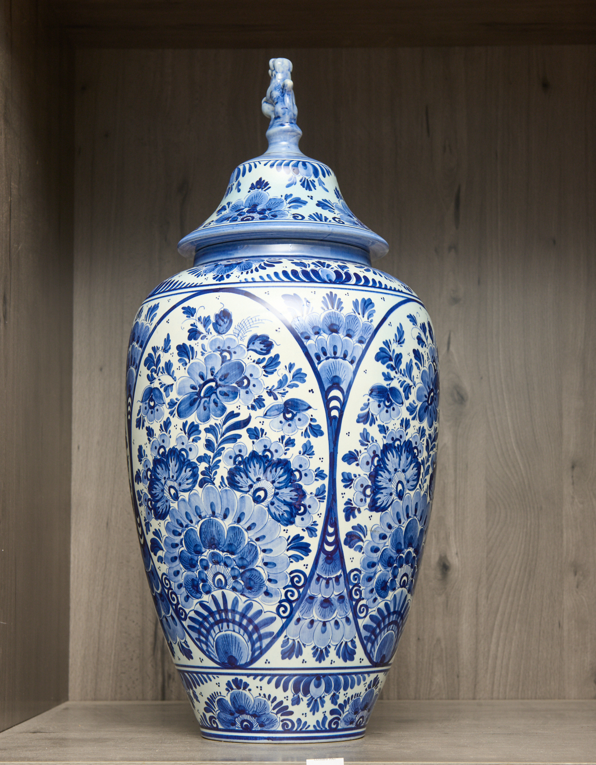 A DELFT LIDDED POT WITH FO LION FINIAL H.55CM, LEONARD JOEL LOCAL DELIVERY SIZE: MEDIUM