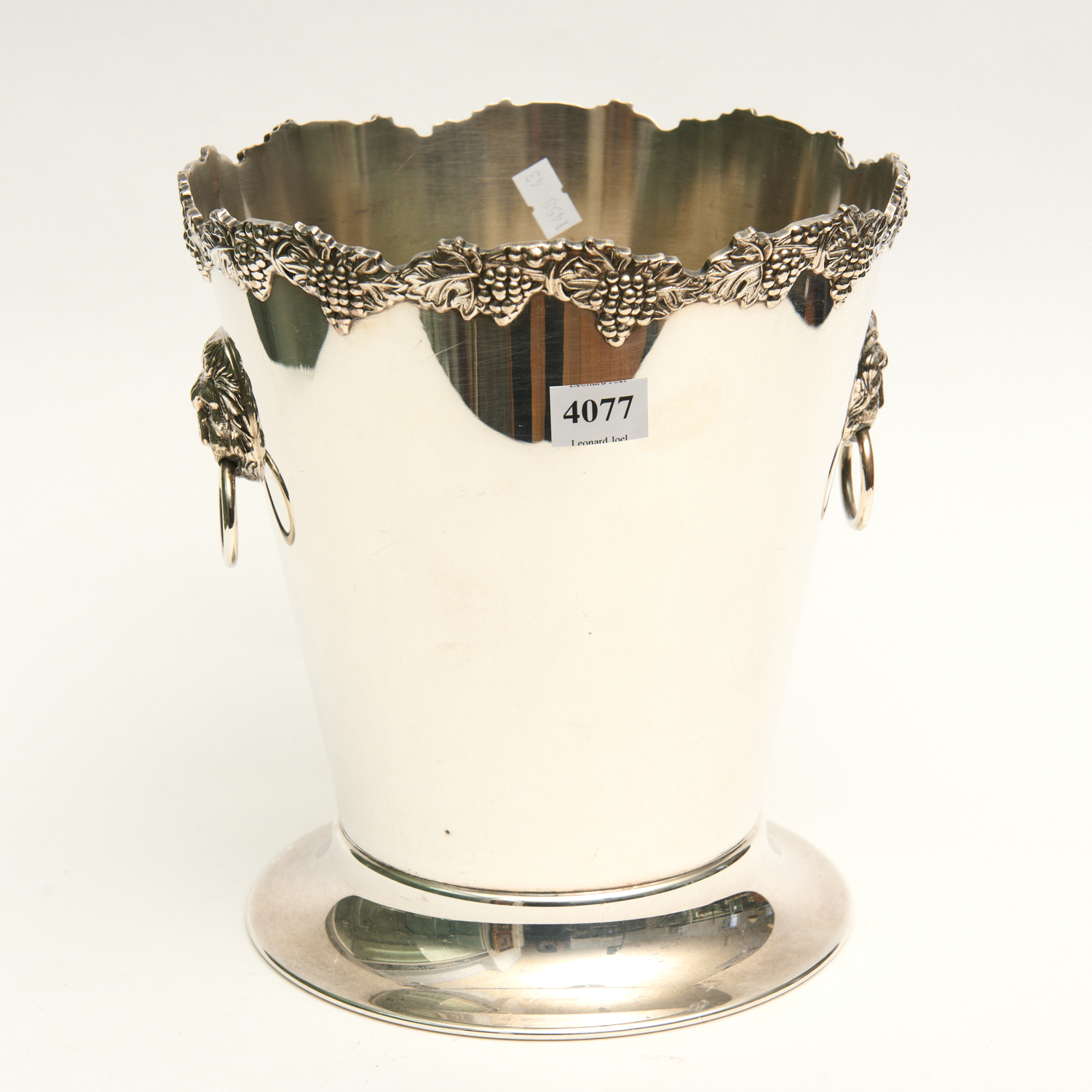 A SILVER PLATE WINE BOTTLE HOLDER WITH LION HEAD HANDLES AND GRAPE VINE DETAILS TO TOP H.22CM, LEONARD JOEL LOCAL DELIVERY SIZE: SMALL