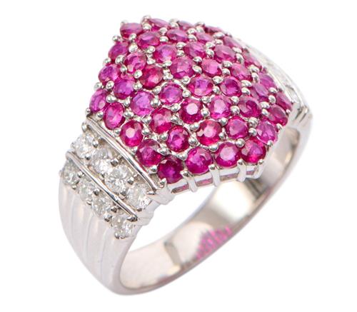 Composed of a hexagonal panel set with circular-cut rubies together weighing approximately 2.04 carats, flanked by rows of round brilliant-cut diamonds together weighing approximately 0.53 carats, ring size M 1/2.