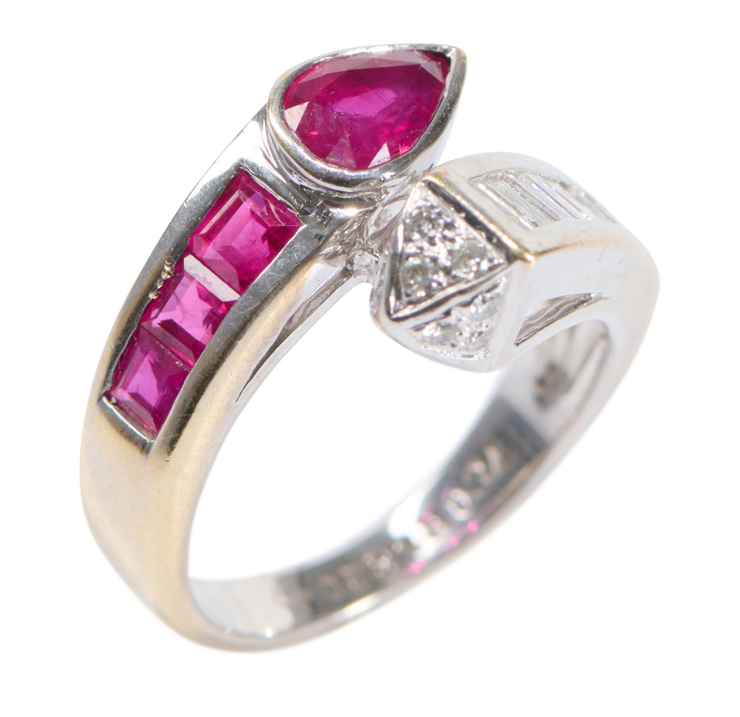Of retro crossover design, composed of square baguette and pear-cut rubies together weighing 1.32 carats, and tapered baguette and round brilliant-cut diamonds together weighing 0.47 carats, ring size K.