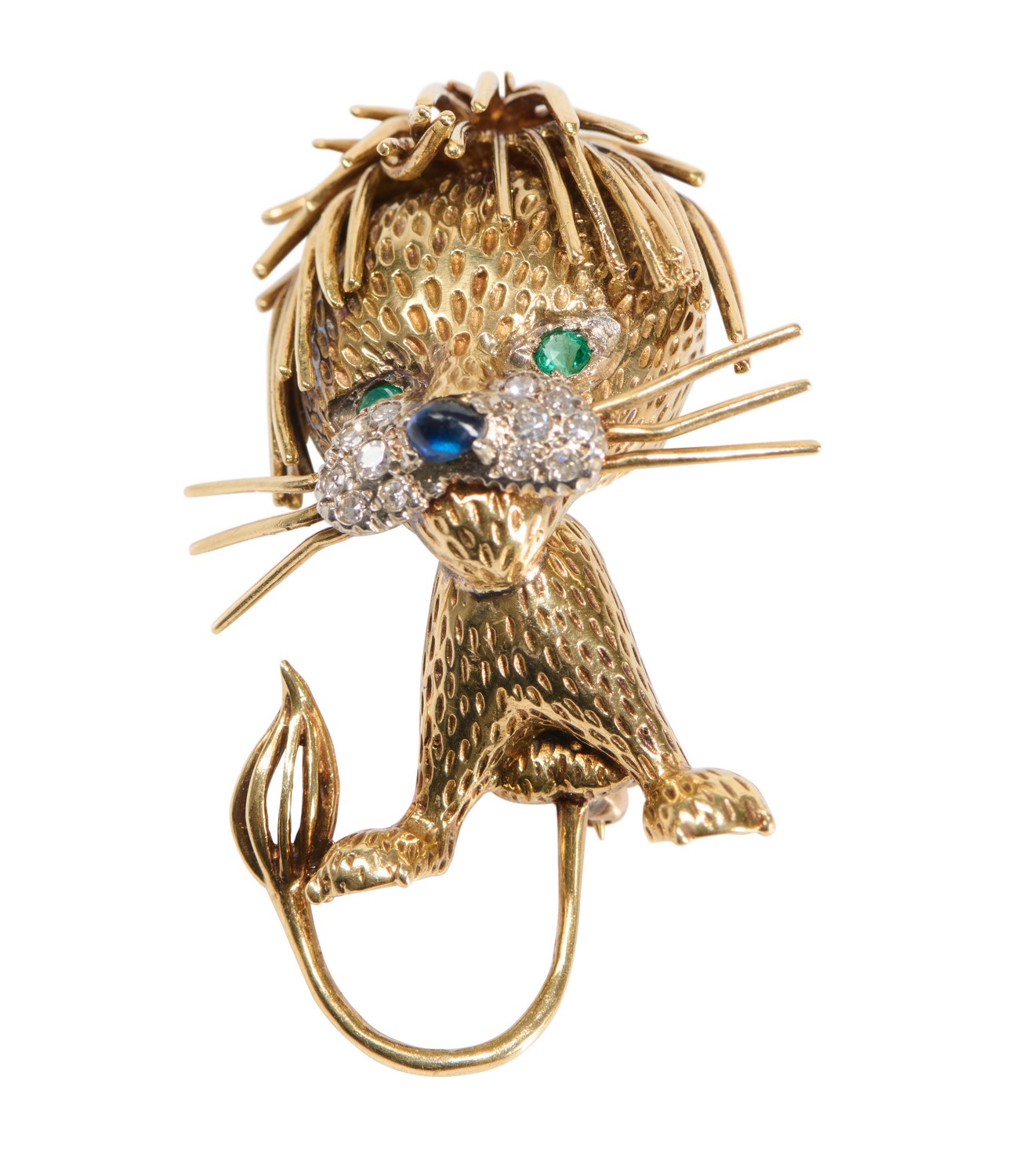 In the form of a lion, the eyes detailed with circular-cut emeralds, the nose with a sapphire cut en cabochon and round brilliant-cut diamonds together weighing approximately 0.15 carats, all in a textured gold finish, signed Kiri, length 450mm.