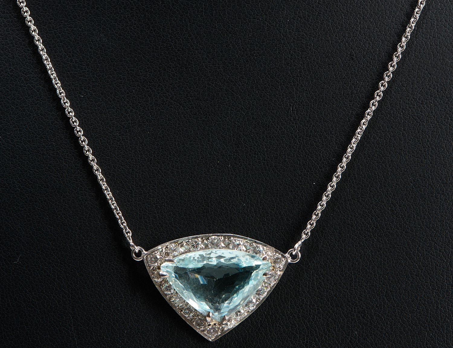 AN AQUAMARINE AND DIAMOND SET PENDANT NECKLACE IN 18CT WHITE GOLD. THE AQUAMARINE APPROXIMATELY 7.00 CTS AND THE DIAMONDS TOTALLING APPROXIMATELY 0.70 CTS G/VS-SI