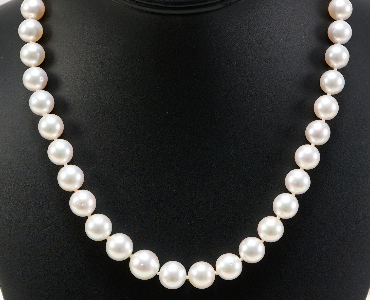 A STRAND OF SOUTH SEA PEARLS TO A 9CT GOLD CLASP, PEARL MEASURING APPROXIAMTLEY 10-12.8MM, LENGTH 490MM
