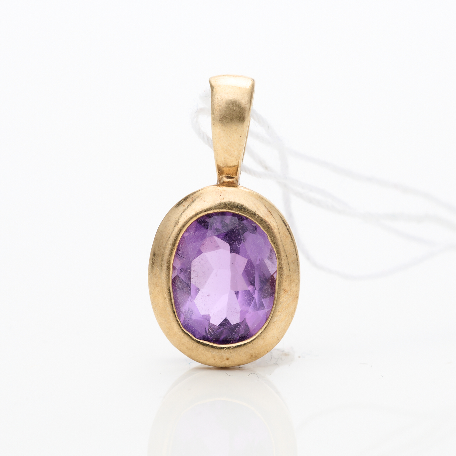 AN AMETHYST SET PENDANT IN 9CT GOLD, 20 X 10MM