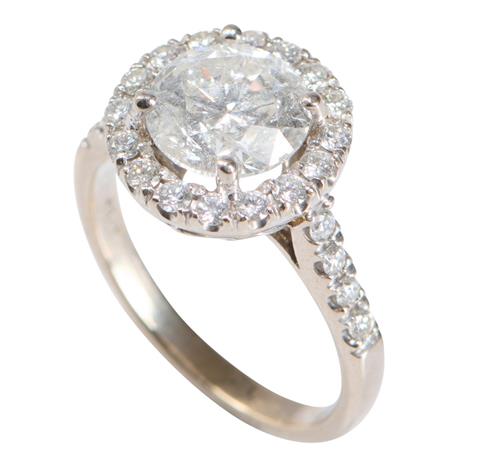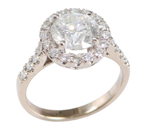 Of cluster design, centring a round brilliant cut diamond weighing 2.02 carats, within a surround of brilliant-cut diamonds and diamond set shoulders together weighing approximately 0.42 carats, ring size L.