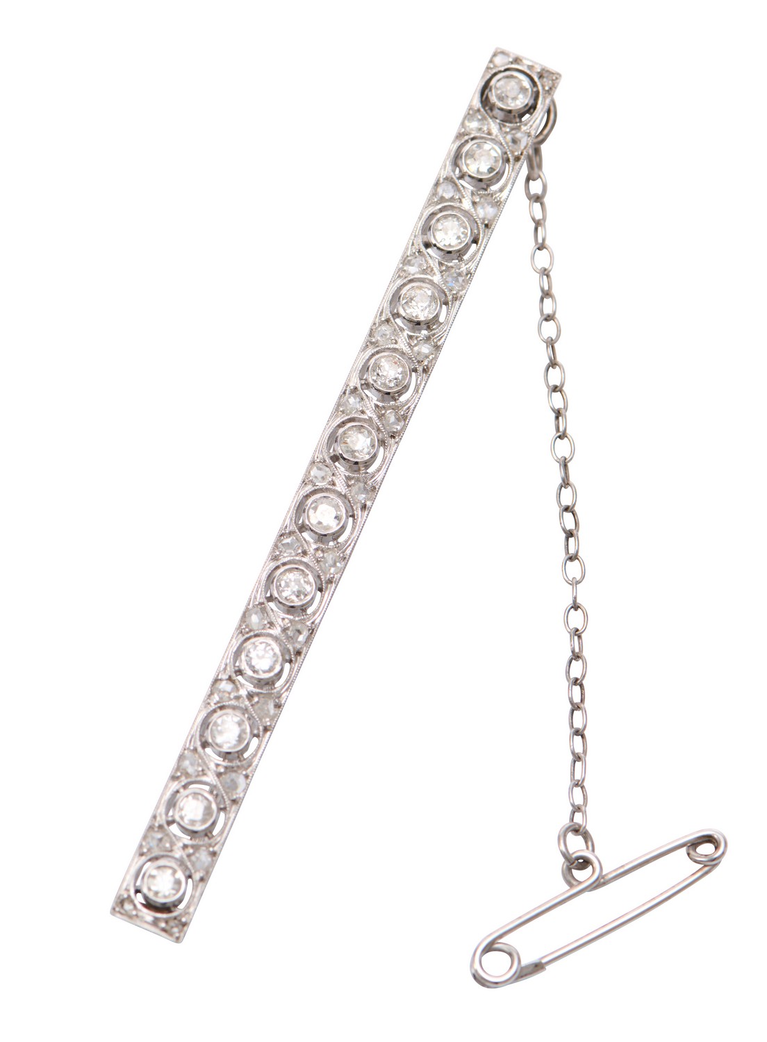 Composed of twelve old European-cut diamonds together weighing approximately 0.50 carats, within a pierced surround detailed throughout with rose-cut diamonds, length 65mm, accompanied by a Potter & Co. Watchmakers, Jewellers and Importers fitted box.