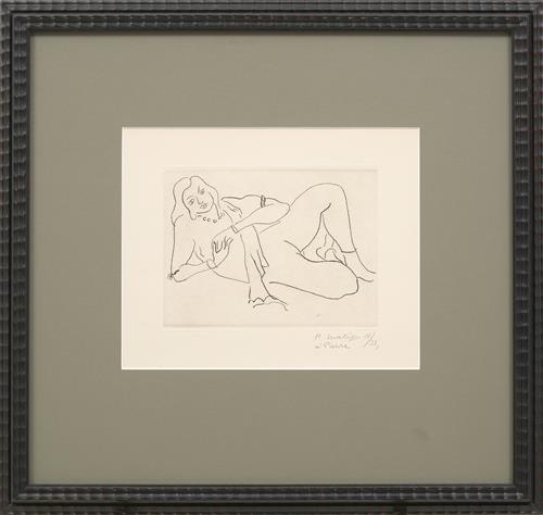 Work is in generally good condition, pale time staining, soft handling creases in places in the margins, pale surface soiling in places in the margins. Well framed in a decorative back frame measuring 51 x 56cm.