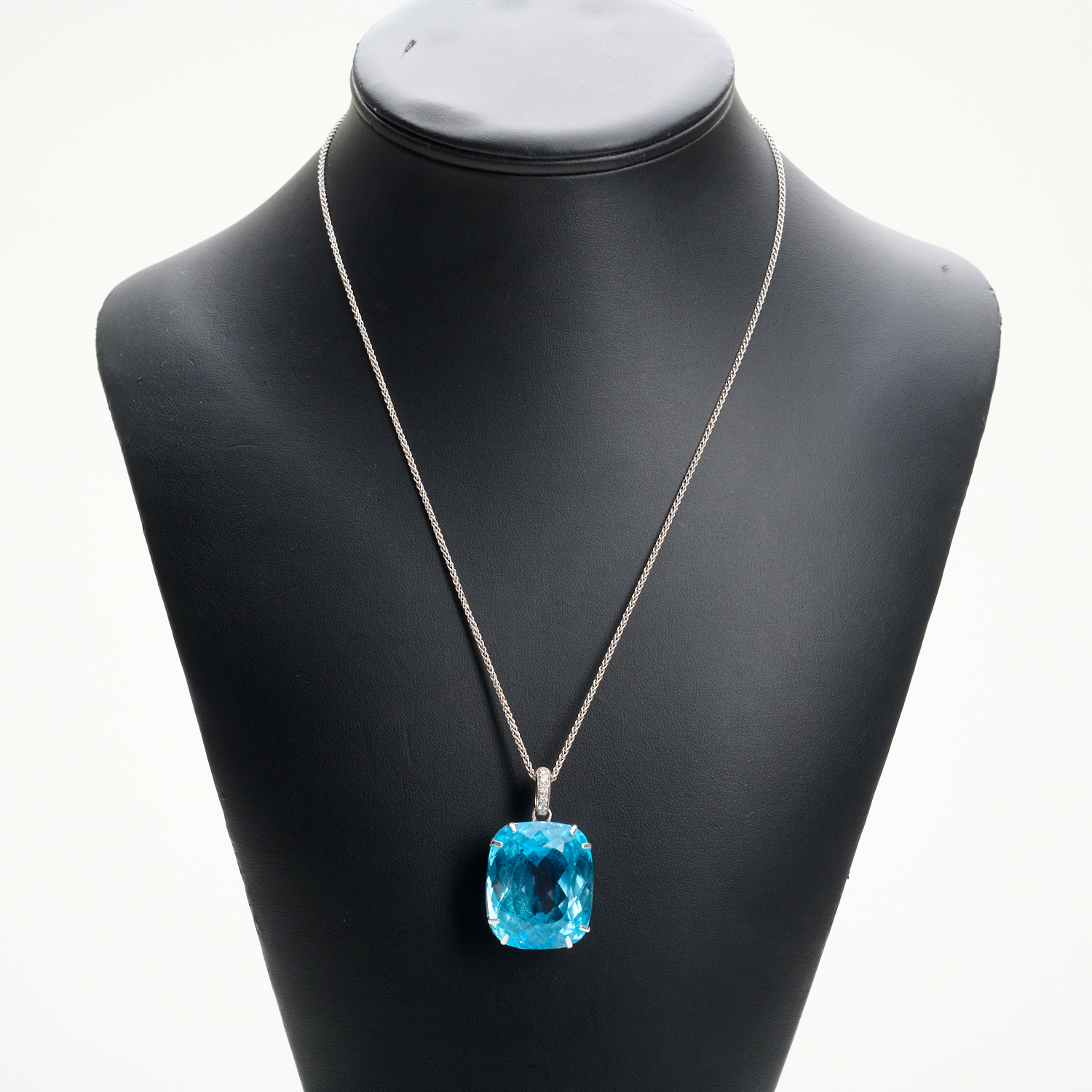 In excellent condition with all stones secure in their settings. The topaz is in fine condition with no chips. The color is a medium blue with a hint of intensity. Approximate stone measurement 21.9 x 26.5 x 16.5mm. Good stones of this size are rare on the market. The mount is of man made construction. The bale is pave set with small diamonds.
