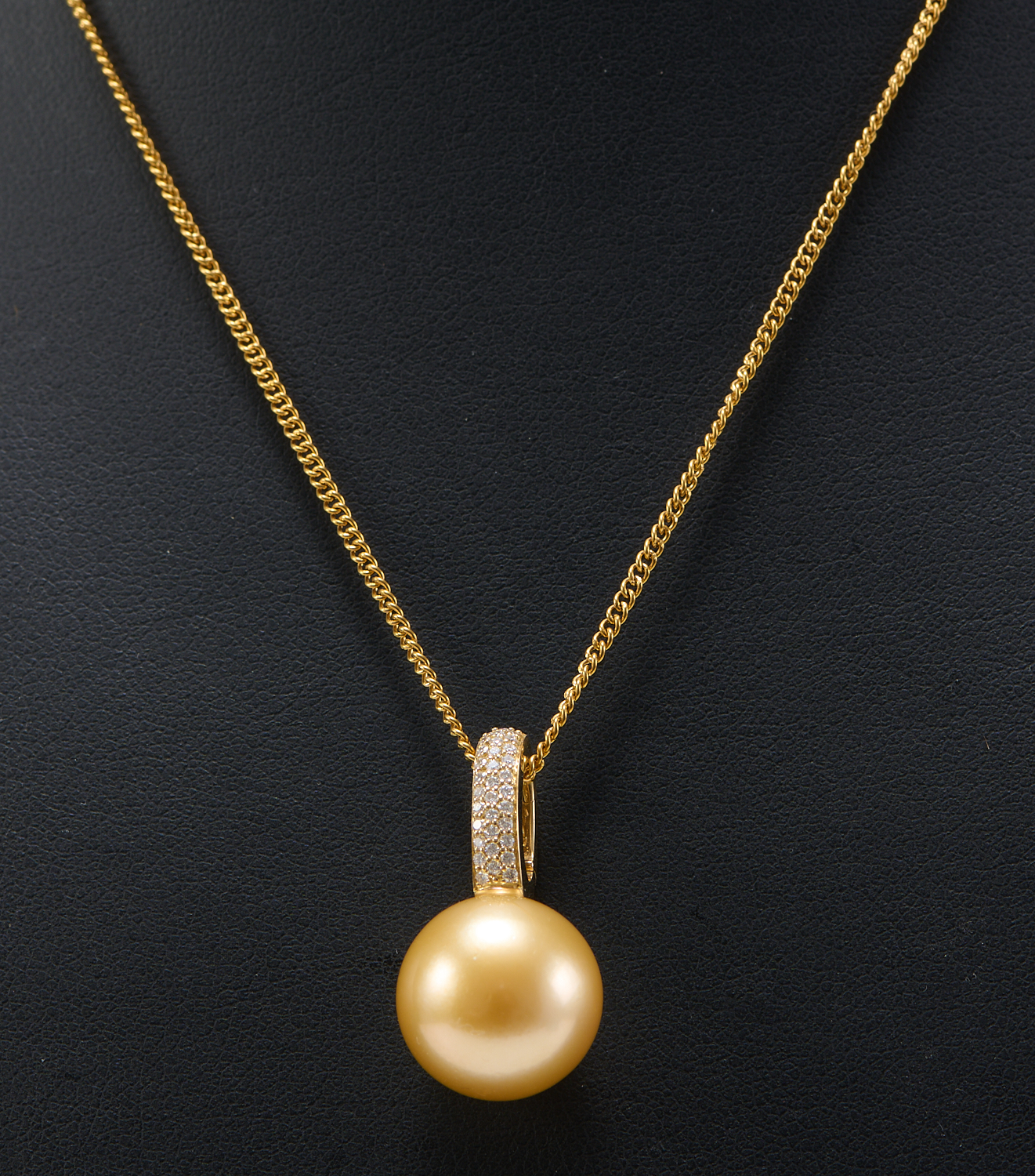 A SOUTH SEA PEARL AND DIAMOND PENDANT IN 18CT GOLD, COMPOSED OF A ROUND PEARL OF GOLDEN HUES MEASURING 14MM, TO A DIAMOND SET BALE TOTALLING 0.14 CARATS, LENGTH 28MM