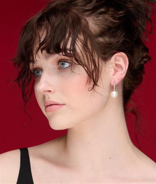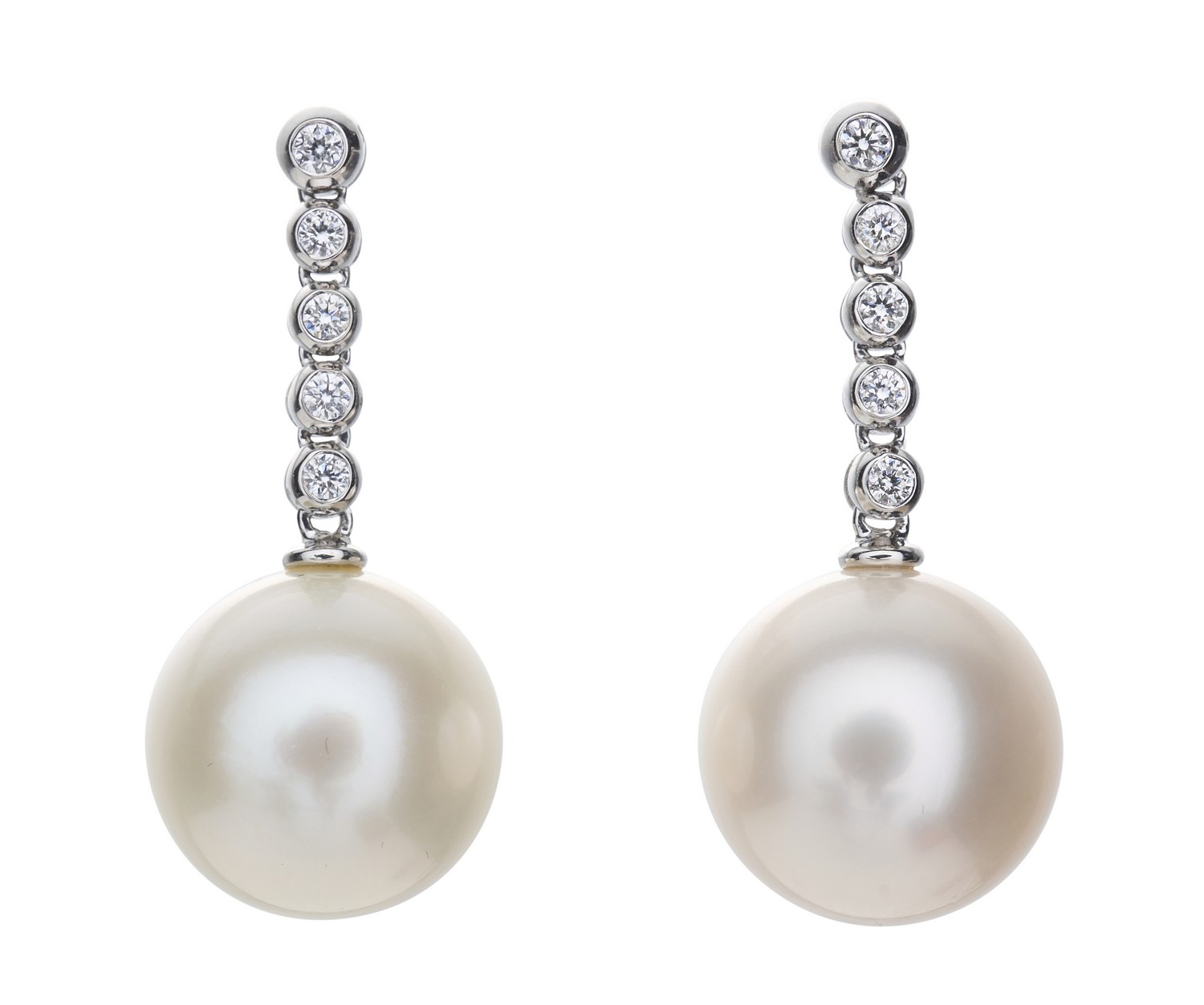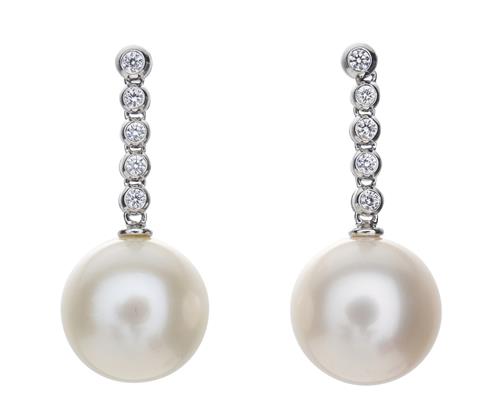 Each earring composed of a round pearl of cream-white hues measuring 12.50mm, suspended from a collet-set diamond drop together weighing approximately 0.18 carats, to post and butterfly fittings, length 26mm.