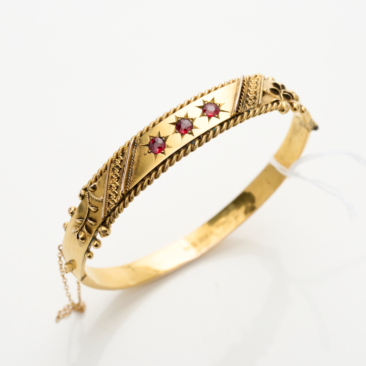 A GARNET TOPPED DOUBLET SET BANGLE, BIRMINGHAM, APPROXIMATELY 1814 INNER DIMENSIONS 6.5CM X 5.5CM