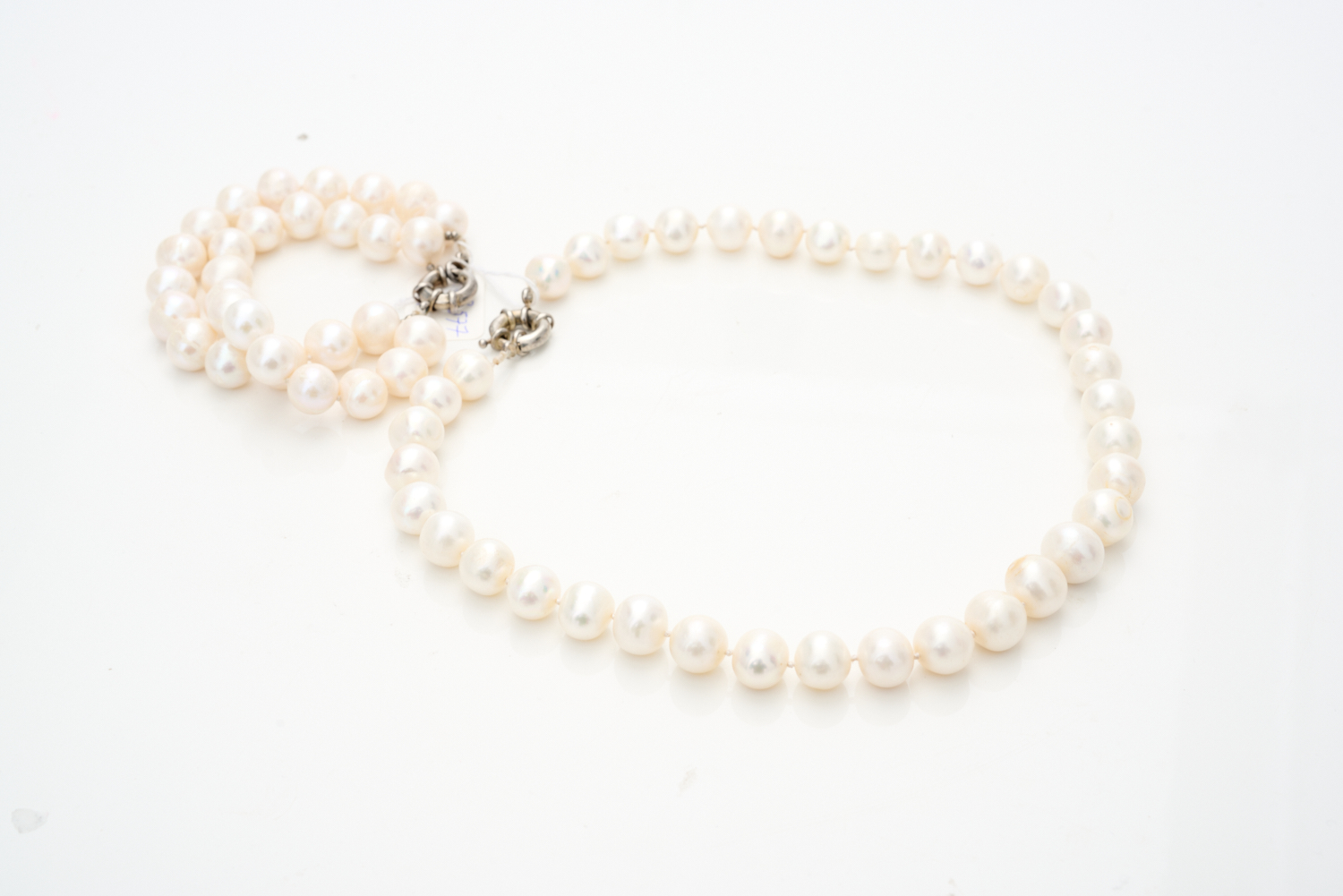 A STAND OF FRESH WATER PEARLS WITH CONFORMING DOUBLE ROW FRESH WATER PEARL BRACELET, BOTH TO SILVER BOLT RING CLASPS.