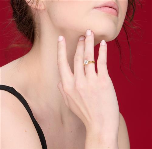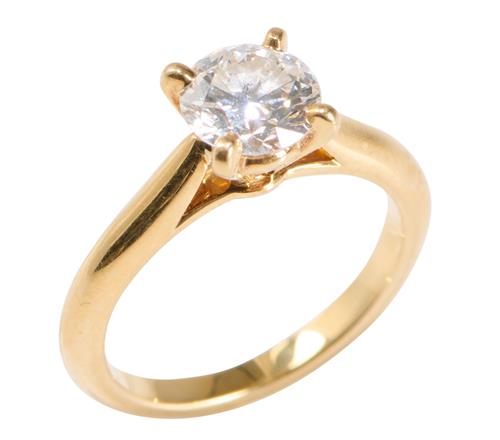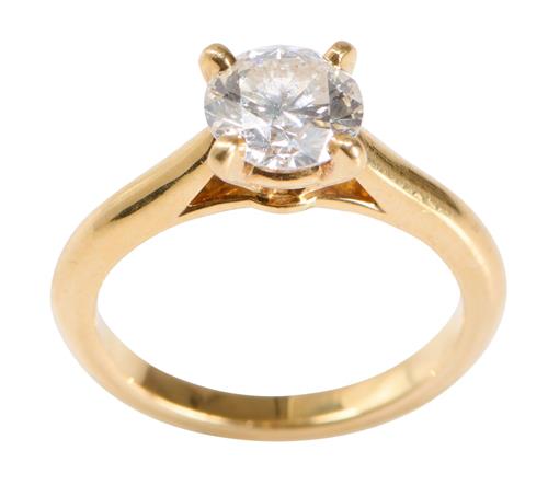 The claw-set round brilliant-cut diamond weighing 1.08 carats, signed Cartier, French marks, ring size J, accompanied by a fitted Cartier box.