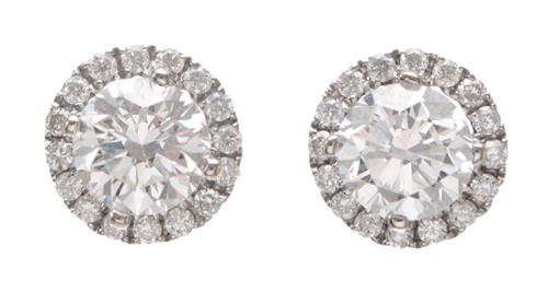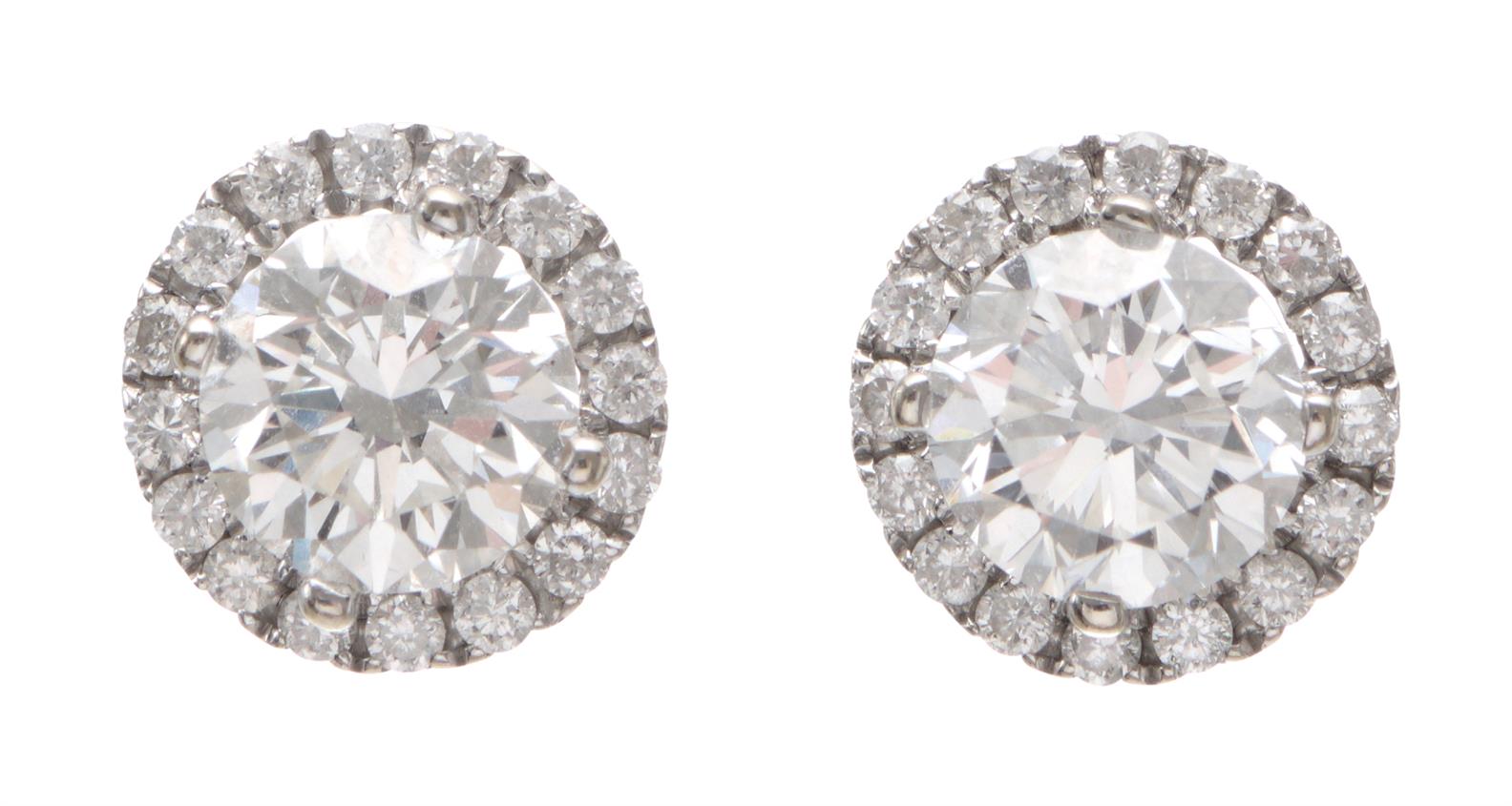Of cluster design, each earring centring a round brilliant-cut diamond weighing approximately 0.89 carats, within a surround of round brilliant-cut diamonds together weighing approximately 0.15 carats, to post and butterfly fittings.