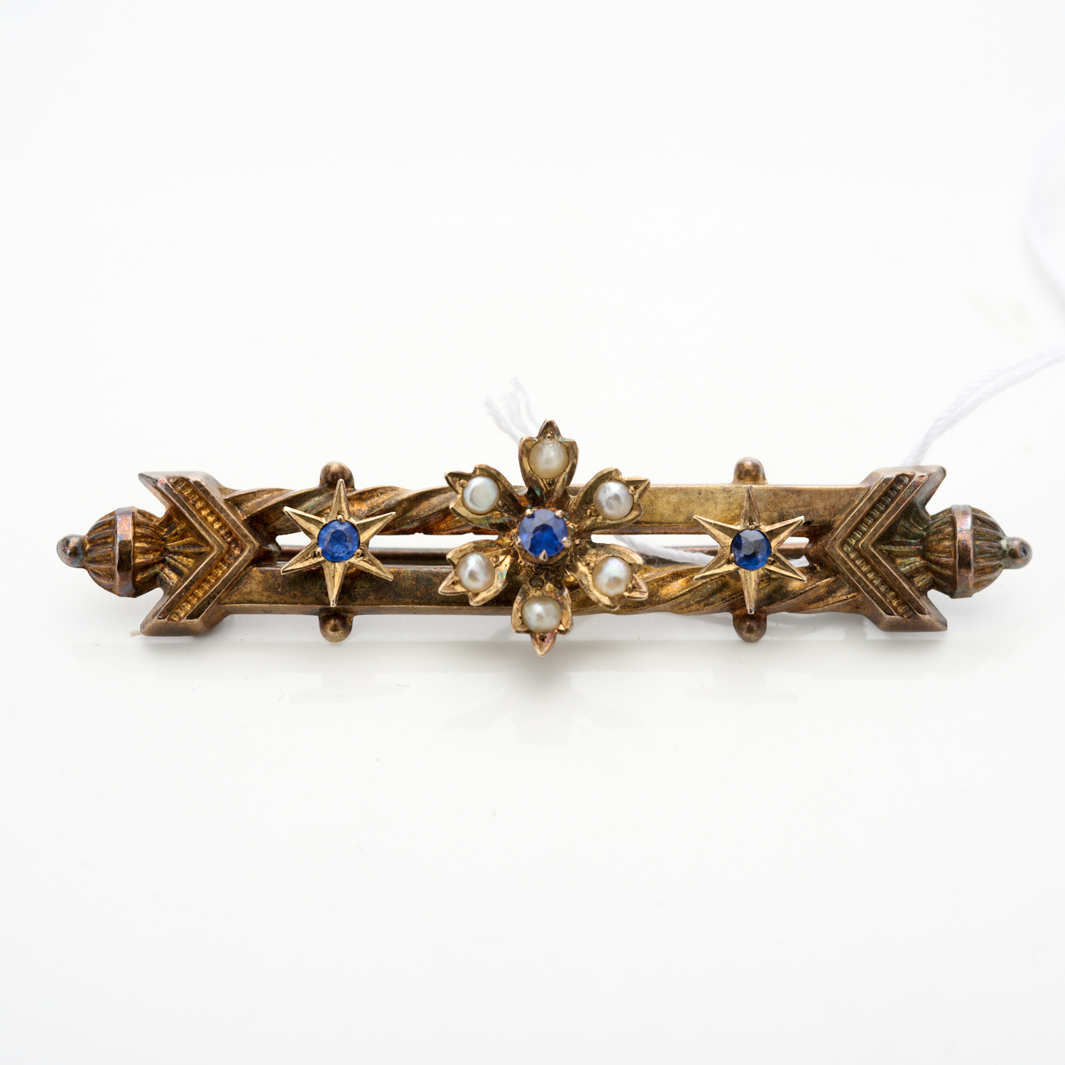 A SAPPHIRE AND PEARL BAR BROOCH IN 15CT GOLD WILLIS AND SONS