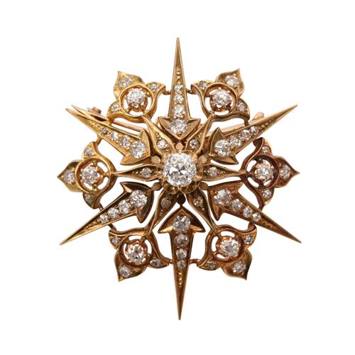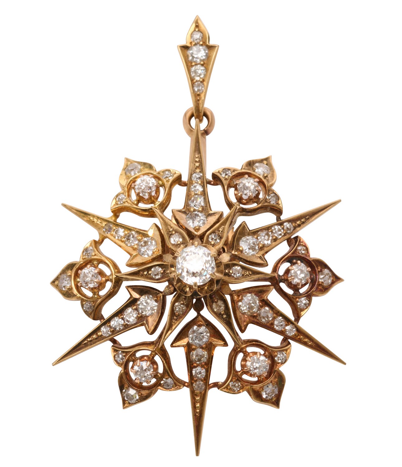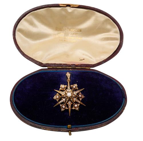 The six-rayed star set through with old European-cut diamonds together weighing approximately 1.30 carats, with pendant and hairslide attachments, accompanied by a Robert Anderson, Glasgow fitted box.