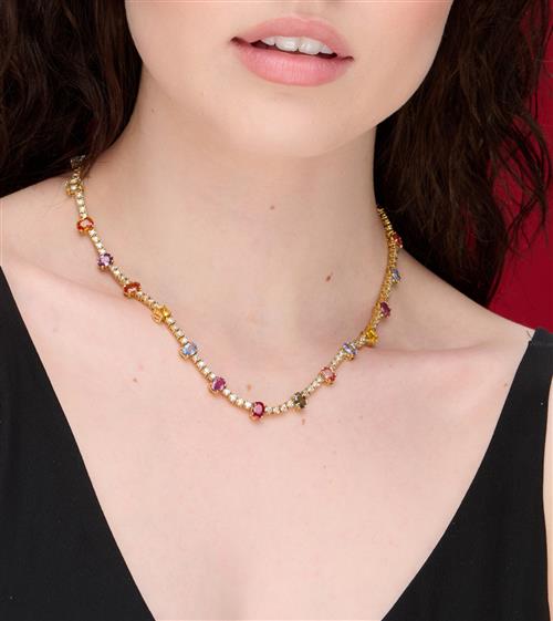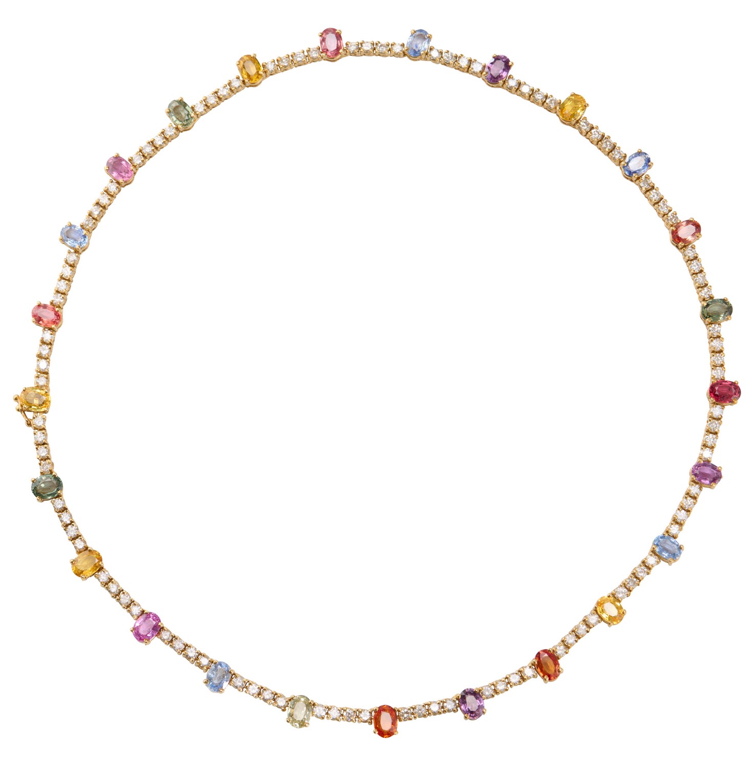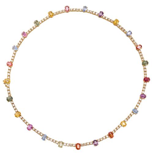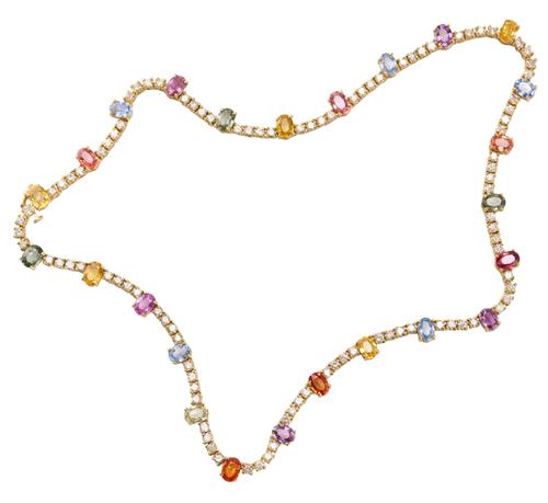Designed as a line of ninety-six round brilliant-cut diamonds together weighing approximately 7.49 carats, set at intervals with twenty-five multi-coloured oval-cut sapphires altogether totalling approximately 23.38 carats, length 460mm.