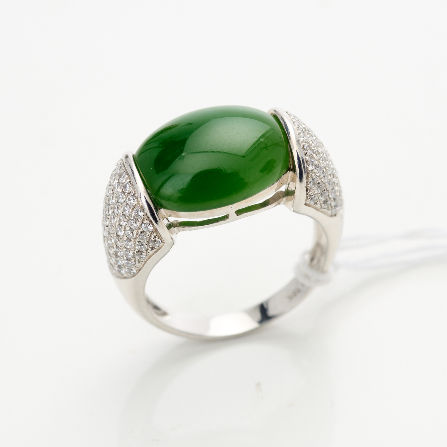 A TREATED JADE AND CZ SET RING IN 18CT WHITE GOLD, SIZE R