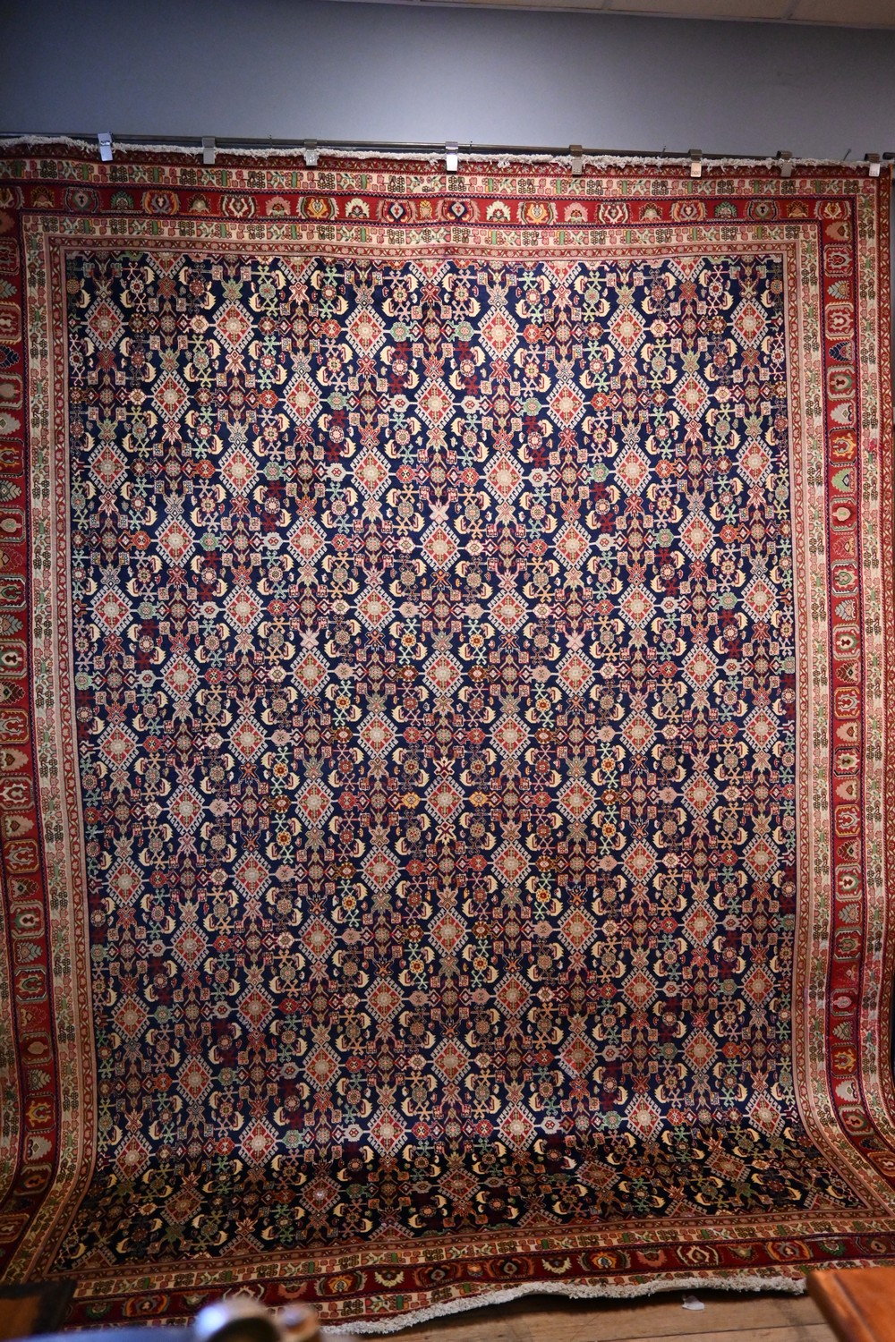 A ONE OF A KIND RARE OFFERING, VERY COLLECTABLE PERSIAN KASHKULI CARPET REPRESENTING THE BEST OF THE BEST OF QASHQAI WEAVERS IN SOUTHERN PERSIA CIRCA 1960S, THIS MASTERPIECE CARPET IS VERY DENSELY WOVEN WITH SUPER FINE 100% HAND SPUN WOOLLEN PILE USING 100% NATURAL DYES AND WELL RECOMMENDED FOR HEAVY TRAFFIC AREAS, COMPRISING OF DEEP PERSIAN INDIGO GROUND COLOURS DOMINATED WITH EXQUISITE RICH CRIMSON BORDER WITH THE MOST INTRICATE & DETAILED HERATI MOTIFS ALL OVER KNOWN AS THE OLDEST MOTIF IN THE HISTORY OF PERSIAN CARPETS, ALSO HIGHLIGHTED WITH FOREST GREEN, GOLD, BEIGE AND CORAL COLOURS THROUGHOUT THE RUG CERTIFICATE OF AUTHENTICITY INCLUDED. SIZE: 390 x 303CM ORIGIN: SOUTHERN PERSIA - RRP: $17,000