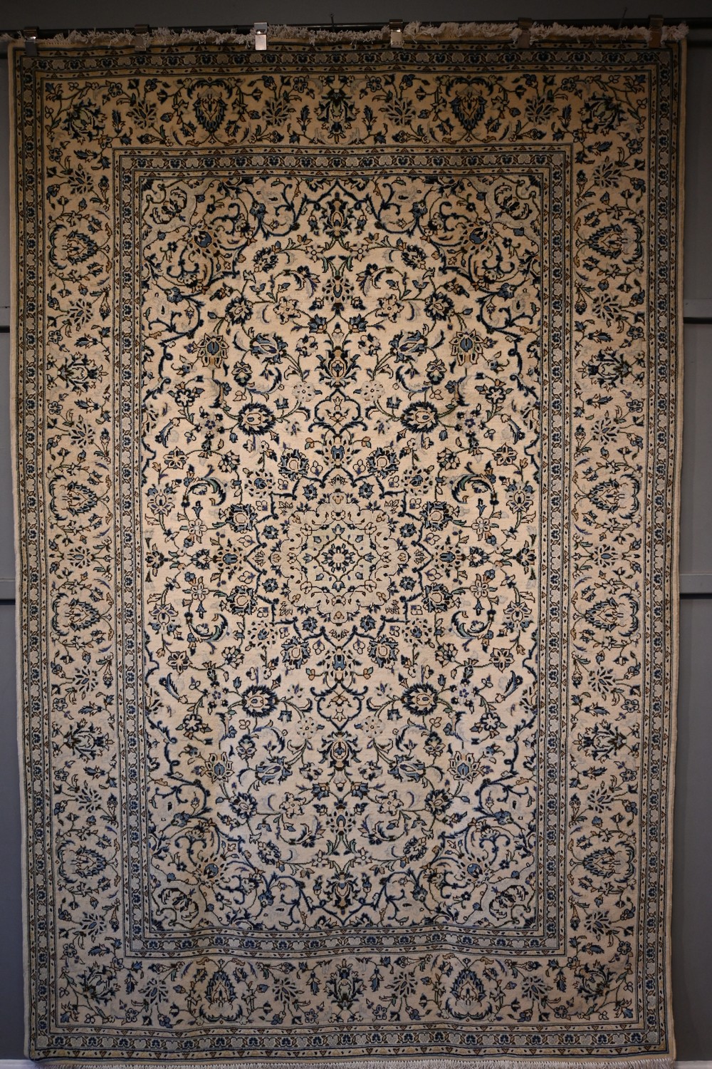 A CIRCA 1970s PERSIAN KASHAN CARPET. 100% FINE WOOL PILE. HAND-KNOTTED KASHAN WEAVE WITH DESIGN OF SUNBURST MEDALLION IN A BEIGE-TONED FIELD OF SHAH ABBASI PALMETTES, ARABESQUE ESLIMI PATTERNS, SAZ LEAVES & FLOWER HEADS. BORDER OF PALMETTES & SAZ LEAVES. PARTIALLY PROFESSIONALLY RESTORED CARPET. CLEAN CONDITION. CERTIFICATE OF AUTHENTICITY INCLUDED. SIZE: 300 X 195 CM ORIGIN: KASHAN/PERSIA - RRP: $3,900