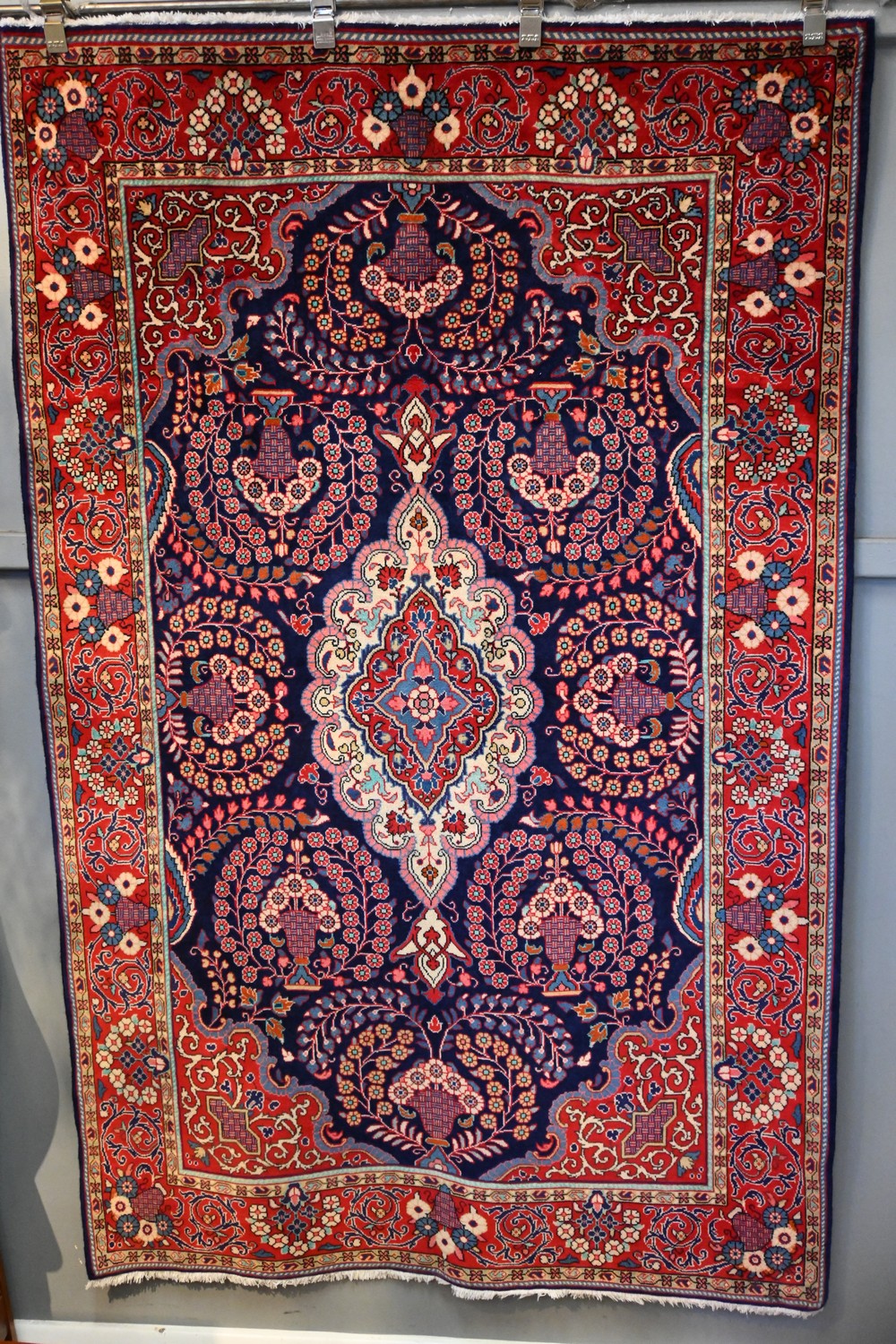 A STUNNING RARE AND COLLECTABLE CIRCA 1970'S PERSIAN SAROUQ CARPET. 100% KORK WOOL. DENSE PLUSH PILE. FINELY HAND KNOTTED CITY WEAVE WITH TRADITIONAL DESIGN OF BOLD ELONGATED MEDALLION IN A ROYAL BLUE FIELD & QUARTERED CORNER MEDALLIONS IN A ROYAL RED FIELD OF PALMETTES & SAZ LEAVES & VASES BARING PLUM BLOSSOM. BORDER OF CARTOUCHE & ESLIMY LEAVES. EX-GALLERY EXHIBITED CARPET. CERTIFICATE OF AUTHENTICITY INCLUDED. SIZE: 214 X 136 CM ORIGIN: PERSIA - RRP: $5,900