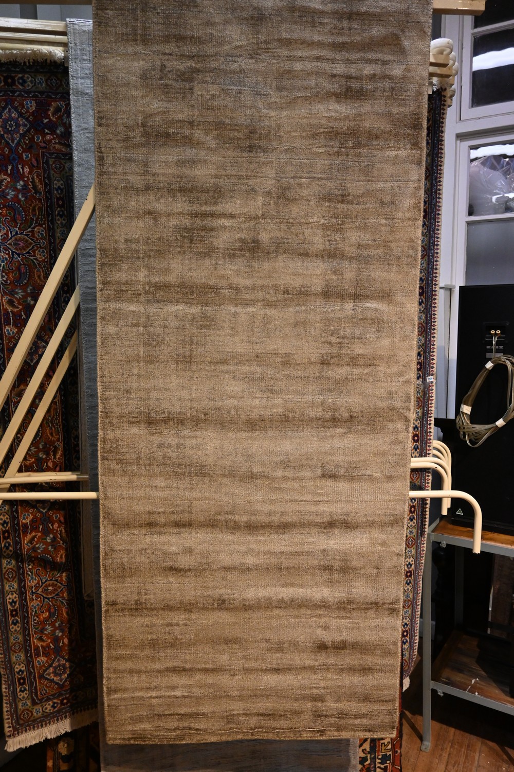 A MODERN CONTEMPORARY COLLECTION HALL RUNNER IN TAUPE AND GOLD TONES, SILKY TEXTURE. SIZE: 305 X 81 CM ORIGIN: INDIA - RRP: $850