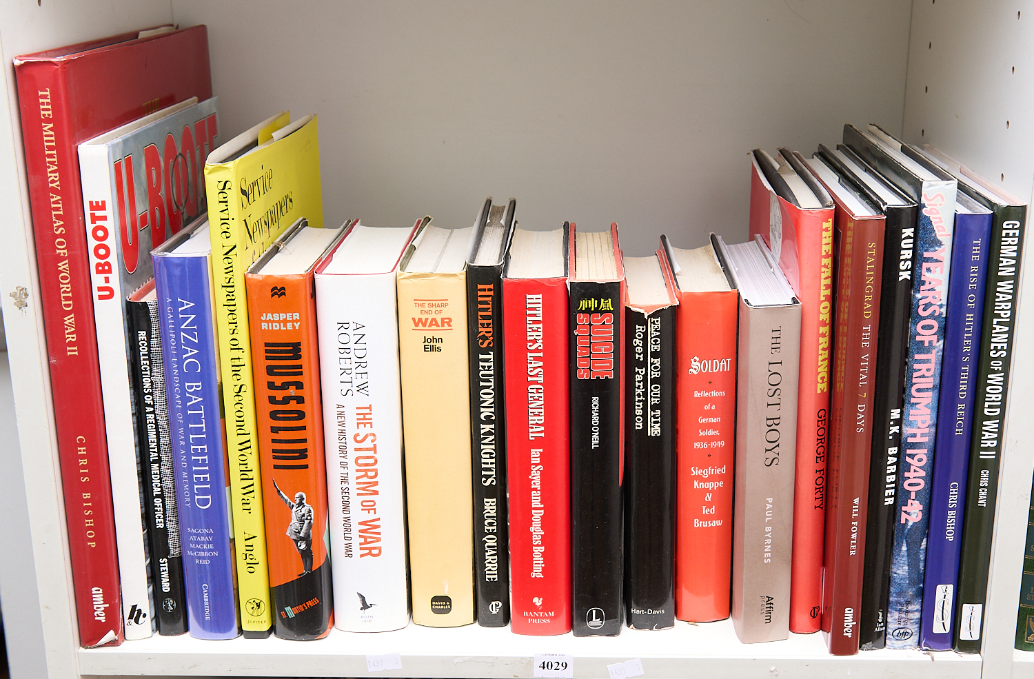 A SHELF OF MILITARY HISTORY REFERENCES, INCLUDING 'ANZAC BATTLEFIELD', AND 'SERVICE NEWSPAPERS OF THE SECOND WORLD WAR', LEONARD JOEL LOCAL DELIVERY SIZE: MEDIUM