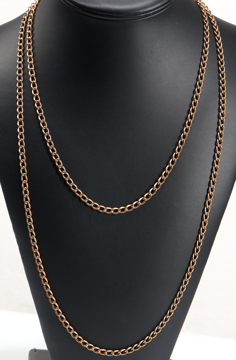 A GUARD CHAIN IN GOLD PLATE, TO A RUBY AND SEED PEARL SET SLIDE IN 9CT GOLD