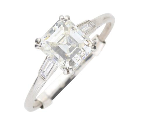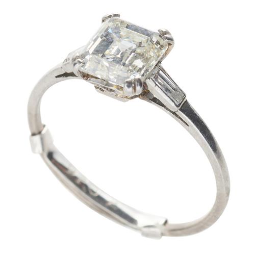 A DIAMOND RING IN PLATINUM, CENTRING A CLAW-SET EMERALD-CUT DIAMOND WEIGHING APPROXIMATELY 1.60 CARATS, FLANKED BY BAGUETTE-CUT DIAMOND SET SHOULDERS TOGETHER WEIGHING APPROXIMATELY 0.16 CARATS, RING SIZE M.