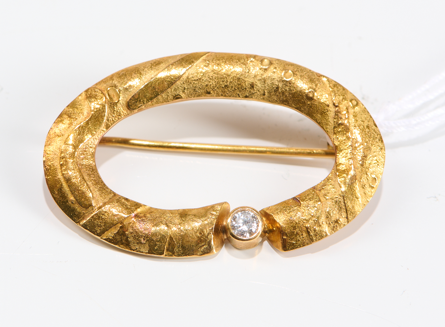 A DIAMOND BROOCH IN 18CT GOLD, SIGNED PETER GERTLER, RETAILED BY MAKERS MARK, SIZE APPROXIMATELY 35MM X 21MM, 5.58GMS