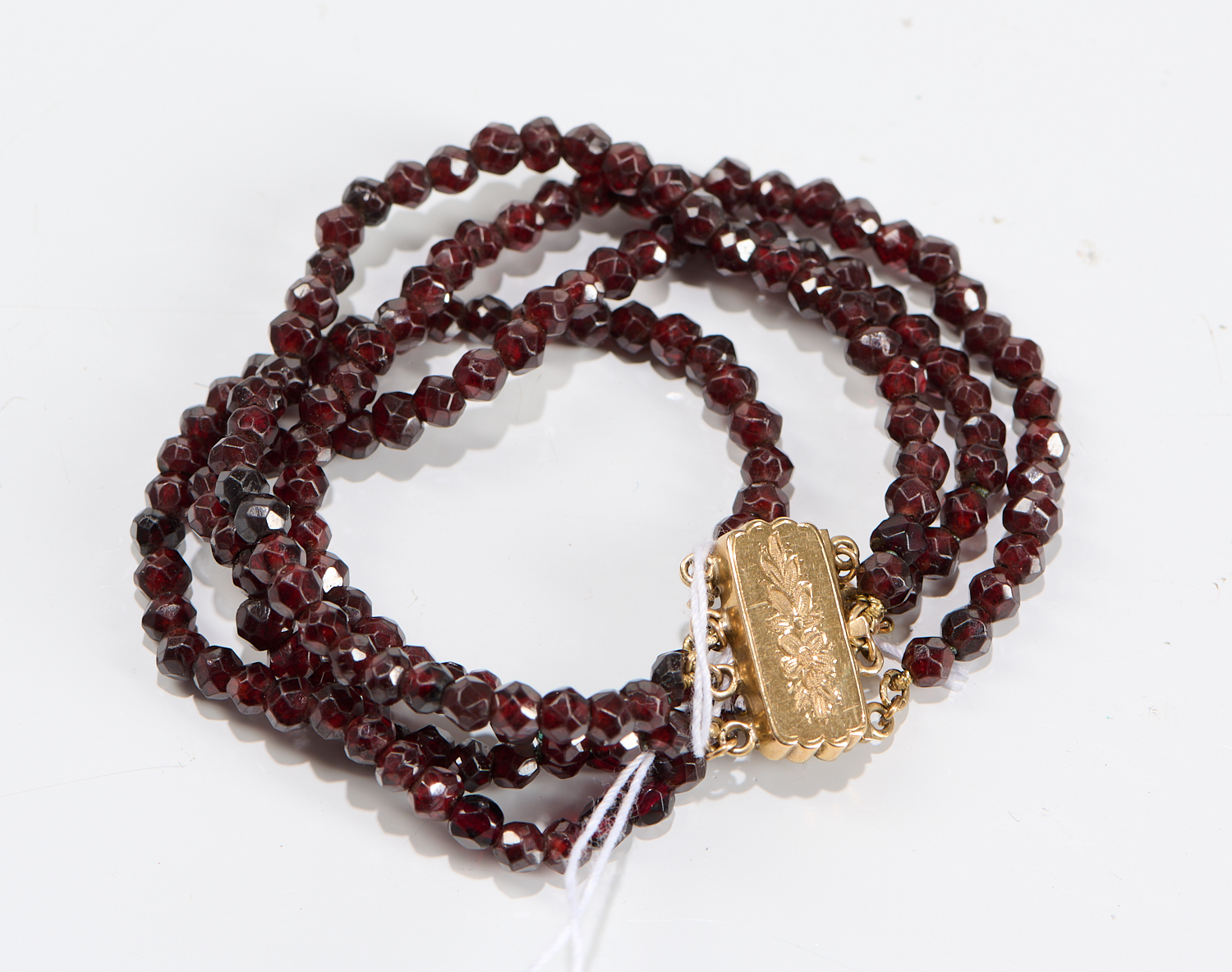 AN ANTIQUE GARNET BEAD BRACELET TO A CLASP IN 14CT GOLD, LENGHT APPROXIMATELY 165MM
