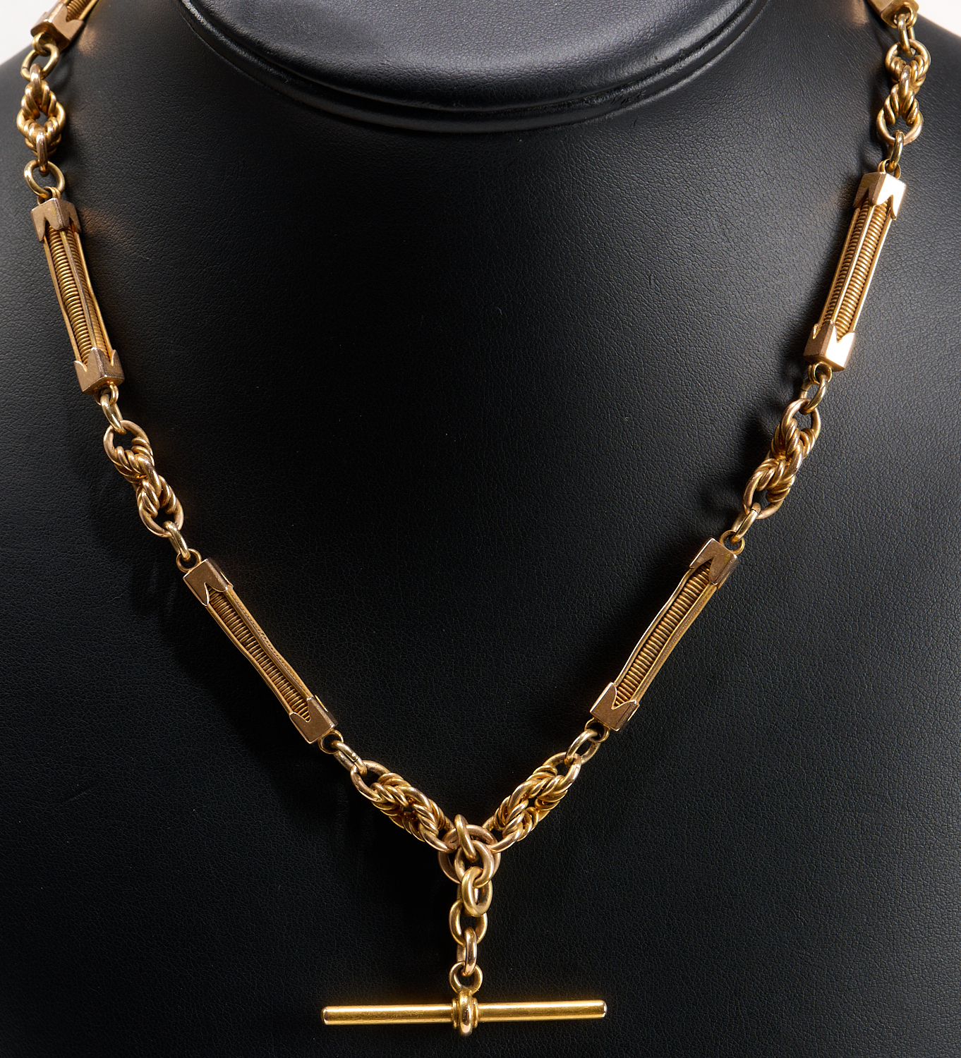 AN ANTIQUE FOB CHAIN IN 15CT AND 18CT GOLD, BRITISH HALLMARKS, TO A GOLD PLATE T-BAR, LENGTH APPROXIMATELY 450MM, TOTAL WEIGHT 57.33GMS