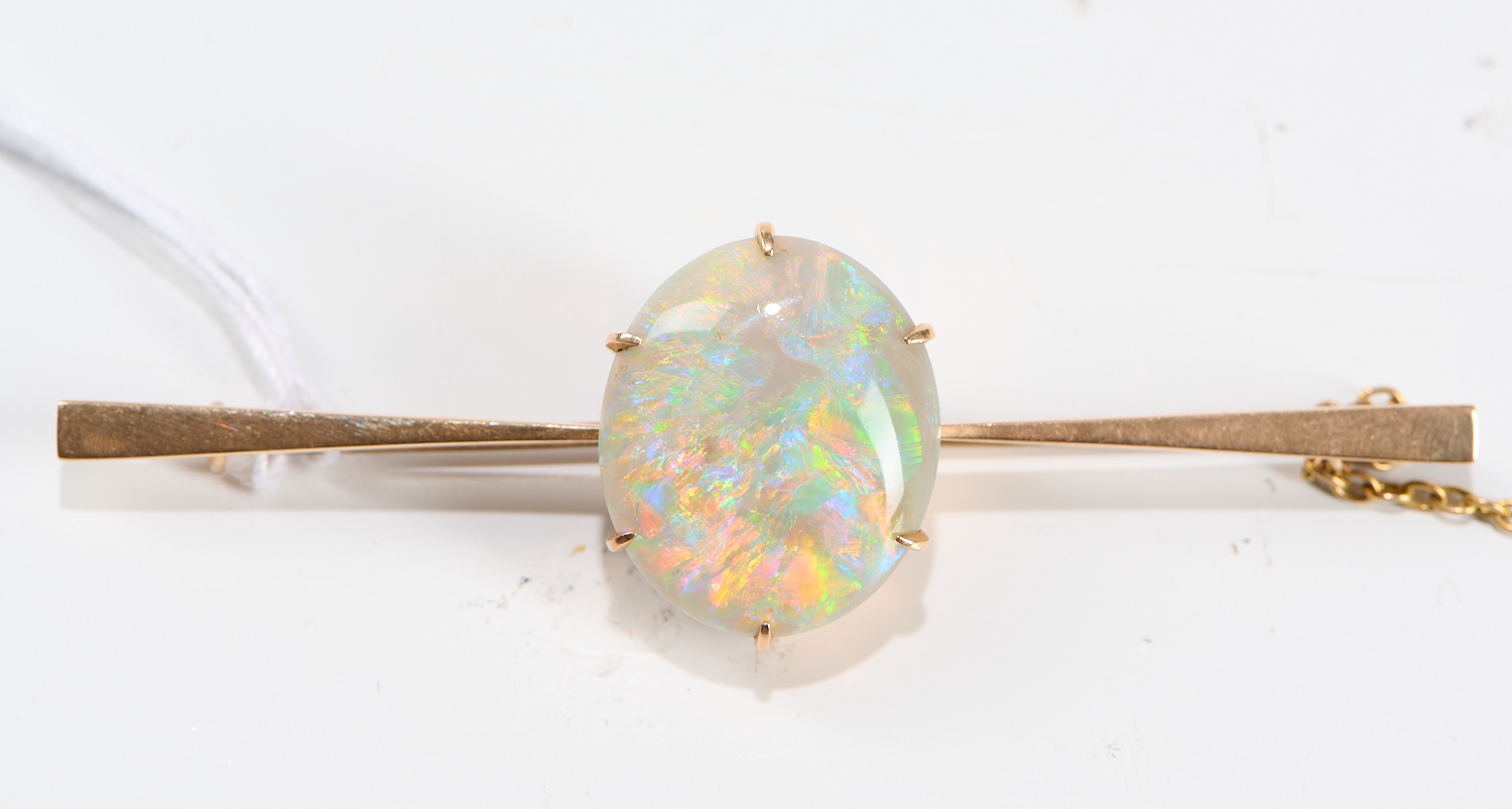 A OPAL SET BROOCH IN 15CT GOLD BY JOSEPH LAWRENCE, LENGTH APPROXIMATELY 65MM