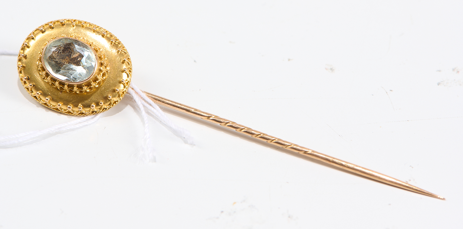 AN ANTIQUE AQUAMARINE SET STICK PIN IN 15CT GOLD, LENGTH APPROXIMATELY 80MM, 4.58GMS