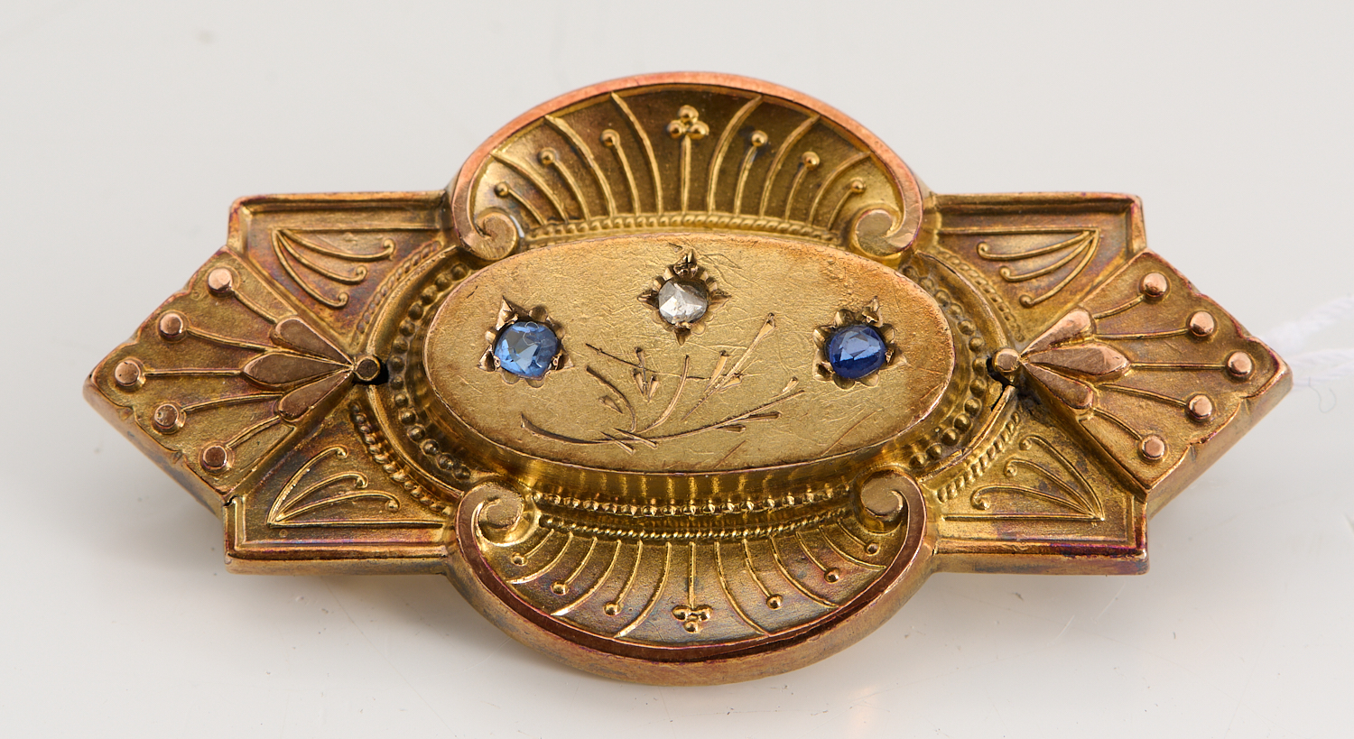 A VICTORIAN PASTE AND DIAMOND SET PENDANT BROOCH IN 18CT GOLD, LENGTH APPROXIMATELY 46MM