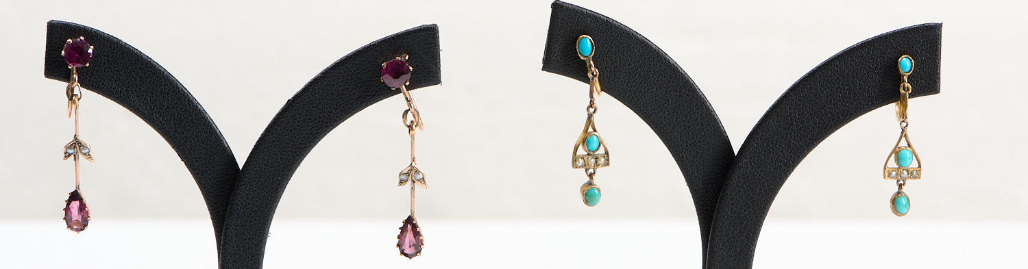 A PAIR OF ANTIQUE AMETHYST AND SEED PEARL EARRINGS IN 9CT GOLD, TOGETHER WITH A PAIR OF ANTIQUE TURQUOISE DROP EARRINGS