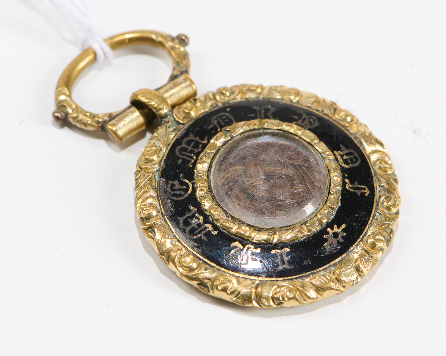 AN ENAMEL MOURNING PENDANT IN 9CT GOLD, DIAMETER APPROXIMATELY 25MM, 7.20GMS