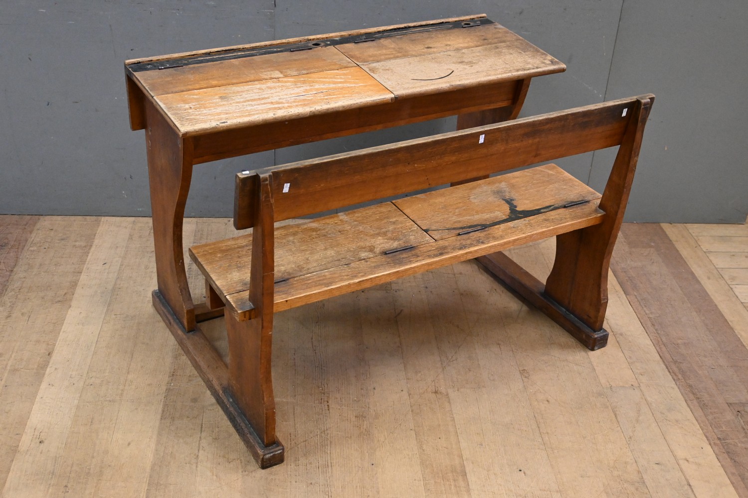 AN EARLY 20TH CENTURY TWO SEATER SCHOOL DESK (77H x 114W x 75D CM) (PLEASE NOTE THIS HEAVY ITEM MUST BE REMOVED BY CARRIERS AT THE CUSTOMER'S EXPENSE. LEONARD JOEL STAFF CANNOT ASSIST CARRYING THIS ITEM) (X-LARGE ITEM)