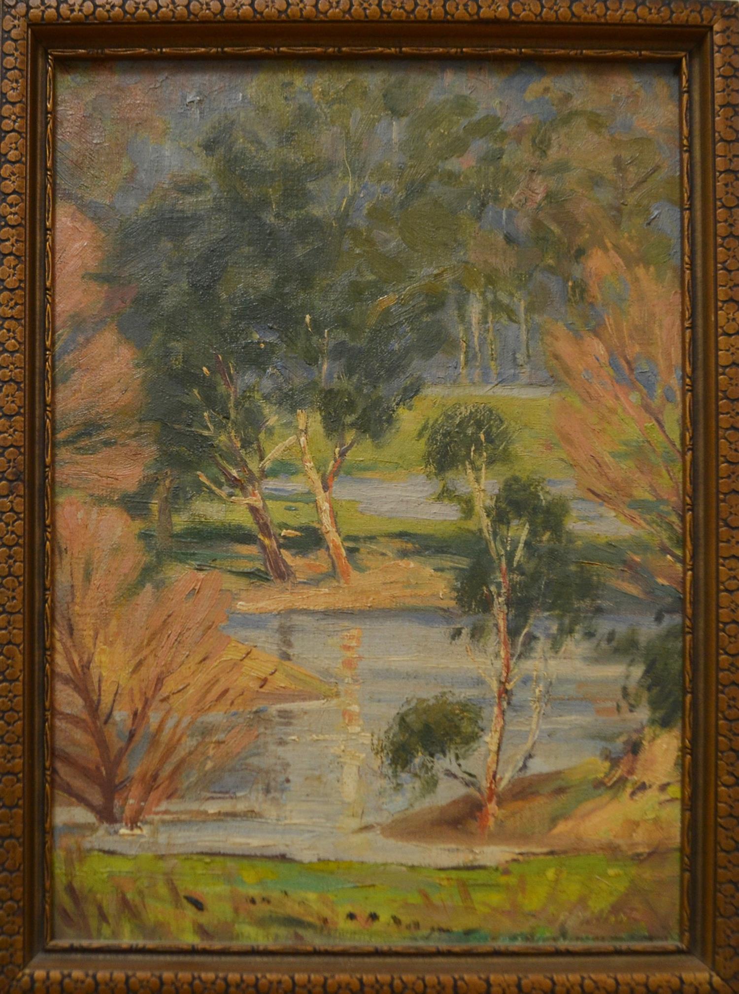 RICHARD MCCANN, HIGHWATER RIVER YARRA AT IVANHOE, OIL ON BOARD, 34.5 X 24.5CM
